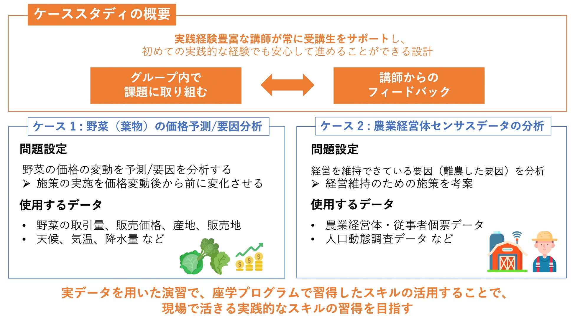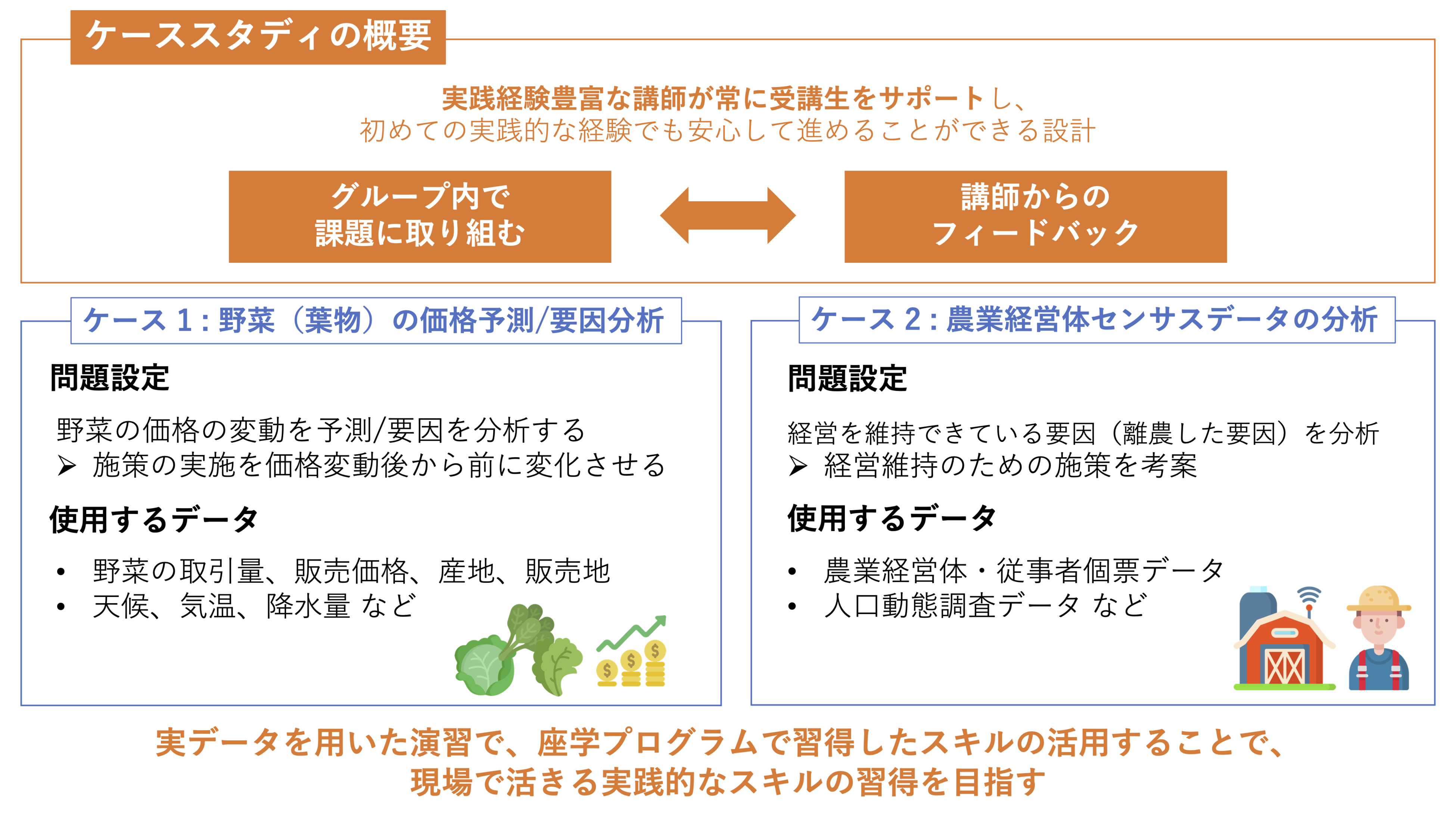 ケーススタディは、農林水産省の担当者とキカガクの講師が協同で取り組み内容を設計し実施しました。実際に省内でデータ活用が求められてる課題に対して、実データを用いて取り組むことで本格的な実践力の習得することを目指しました。