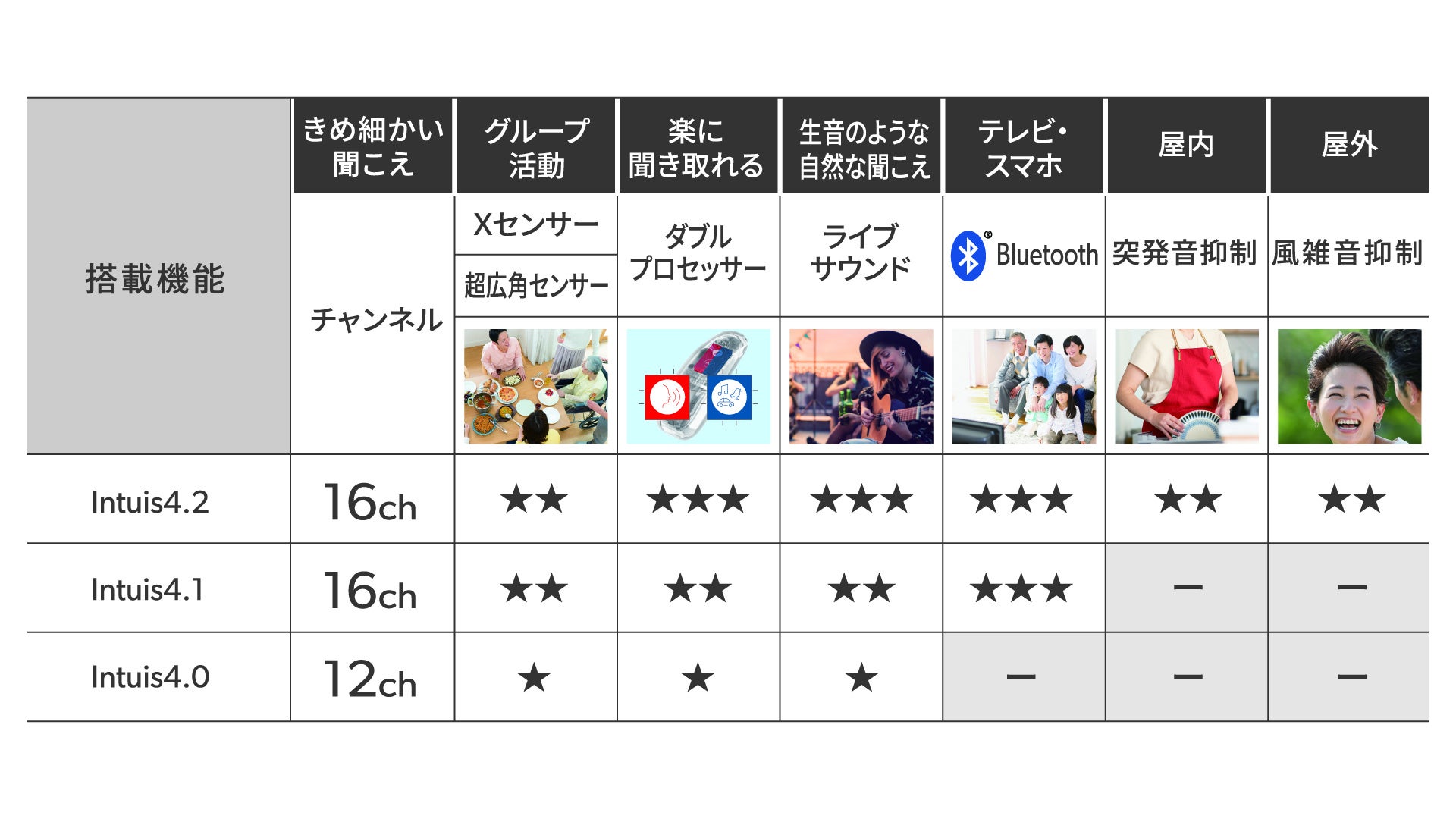 Intuis4シリーズの3器種は、それぞれ3つのクラスを展開しています。テレビ・スマートフォンの音声をより良く聞き取りたい人は、Bluetooth機能搭載の4.1クラスがお勧めです。さらに外出が多い人は、屋内外の風雑音や突発音を抑制する機能を搭載している4.2クラスが活躍します。4.0クラスは基本機能のみ利用する人向けのスターターモデルです。