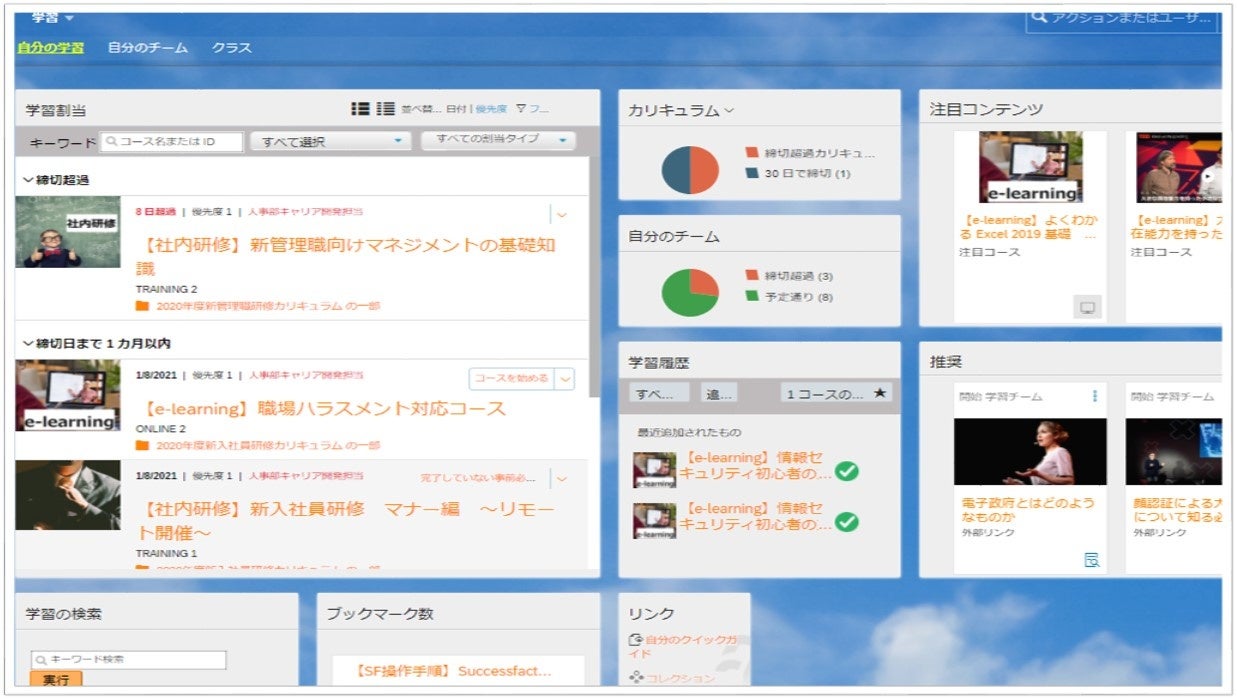 ・社員専用の学習ホームから、自分に割り当てられた研修課題の情報確認や、eラーニングや集合研修の受講一覧を、優先度や受講期限ごとに確認します。