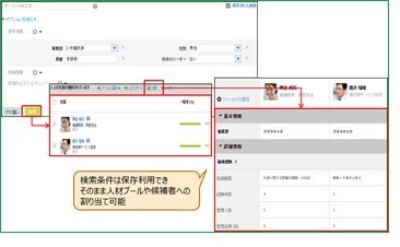 ・後継者としてふさわしい従業員の検索が可能、結果は各項目の一致率に応じて出力され、比較も可能です。