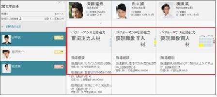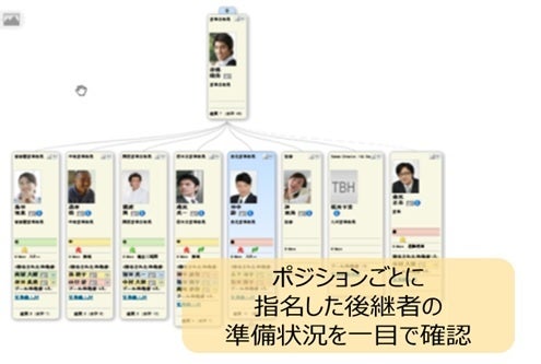 ・登録された情報に基づき、各ポジションの後継者有無が表示され、現職者のステータスも一目で判別。現職者や後継者について社員プロファイルに登録された情報で比較する事も可能です。