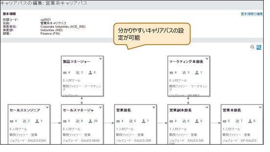 ・各従業員の指針として活用できるキャリアパスの定義、ジョブやポジションに対して必要な経験や スキル等の職務定義の定義が可能です。