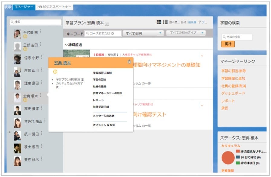 ・上司が部下の学習進捗を管理することや研修の推奨、割当、申請、ワークフロー承認も可能です。