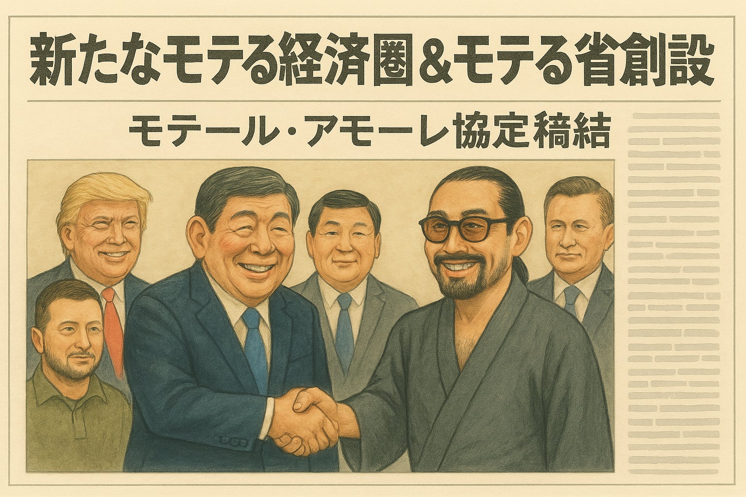 「世界にモテる度ランキング」日本人男性と女性のNo.1を受け、日本の社会問題の解決と国力強化に積極的戦略投資を進めていくことを日本内閣総理大臣が閣議決定。同時にモテる省を創設。さらに、世界平和のための新国際秩序と国際協調に繋がるモテールアモーレ協定を積極的に締結。
