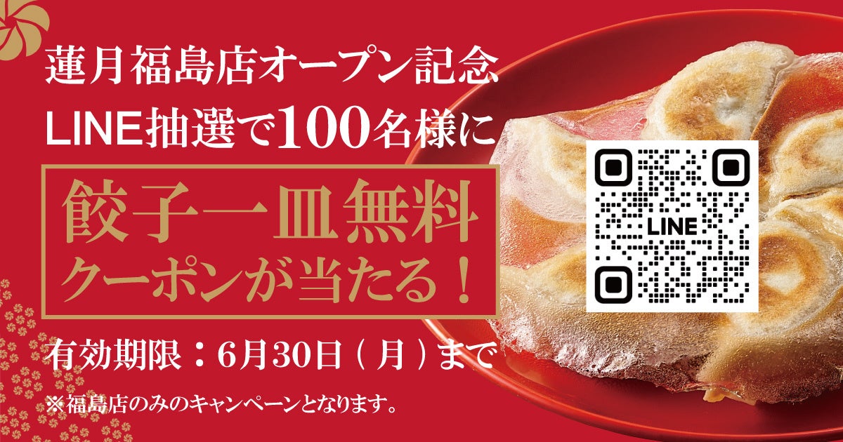 オープンを記念して抽選で100名様に、名物「特製手作り焼き餃子」が“一皿無料”になるクーポンを、福島店公式LINEにて限定配布開始!