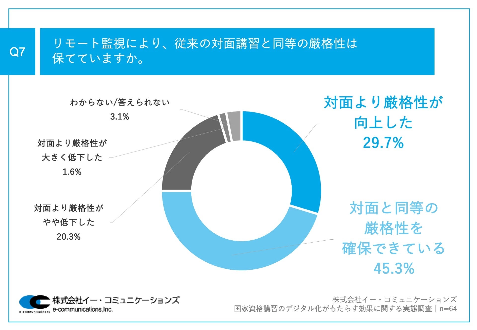 Q5で「行っている」と回答した方に、「Q7.リモート監視により、従来の対面講習と同等の厳格性は保てていますか。」(n=64)と質問したところ、「対面より厳格性が向上した」が29.7%、「対面と同等の厳格性を確保できている」が45.3%という回答となりました。