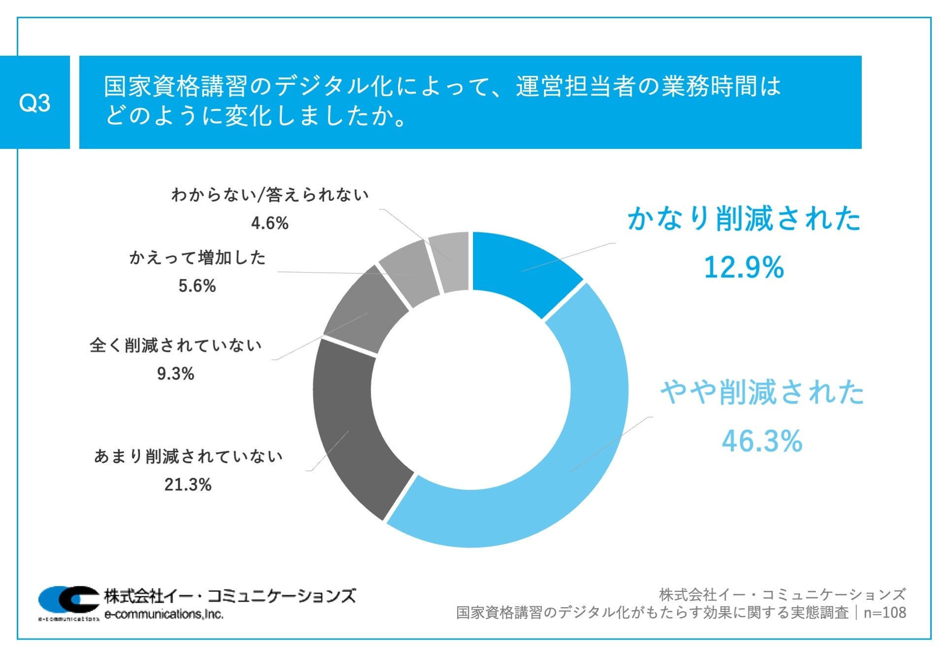 「Q3.国家資格講習のデジタル化によって、運営担当者の業務時間はどのように変化しましたか。」(n=108)と質問したところ、「かなり削減された」が12.9%、「やや削減された」が46.3%という回答となりました。