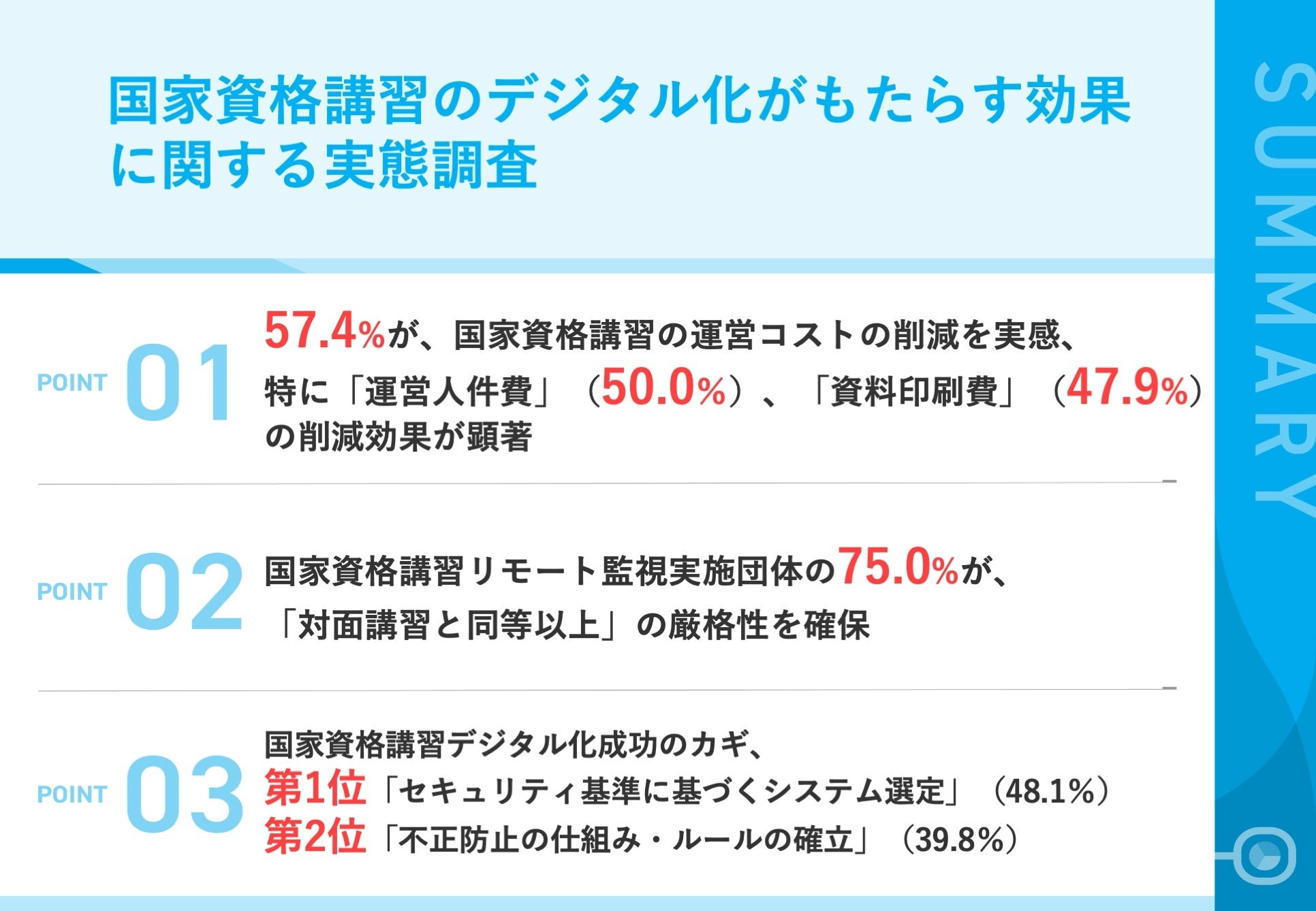 01|57.4%が、国家資格講習の運営コストの削減を実感、特に「運営人件費」(50.0%)、「資料印刷費」(47.9%)の削減効果が顕著
