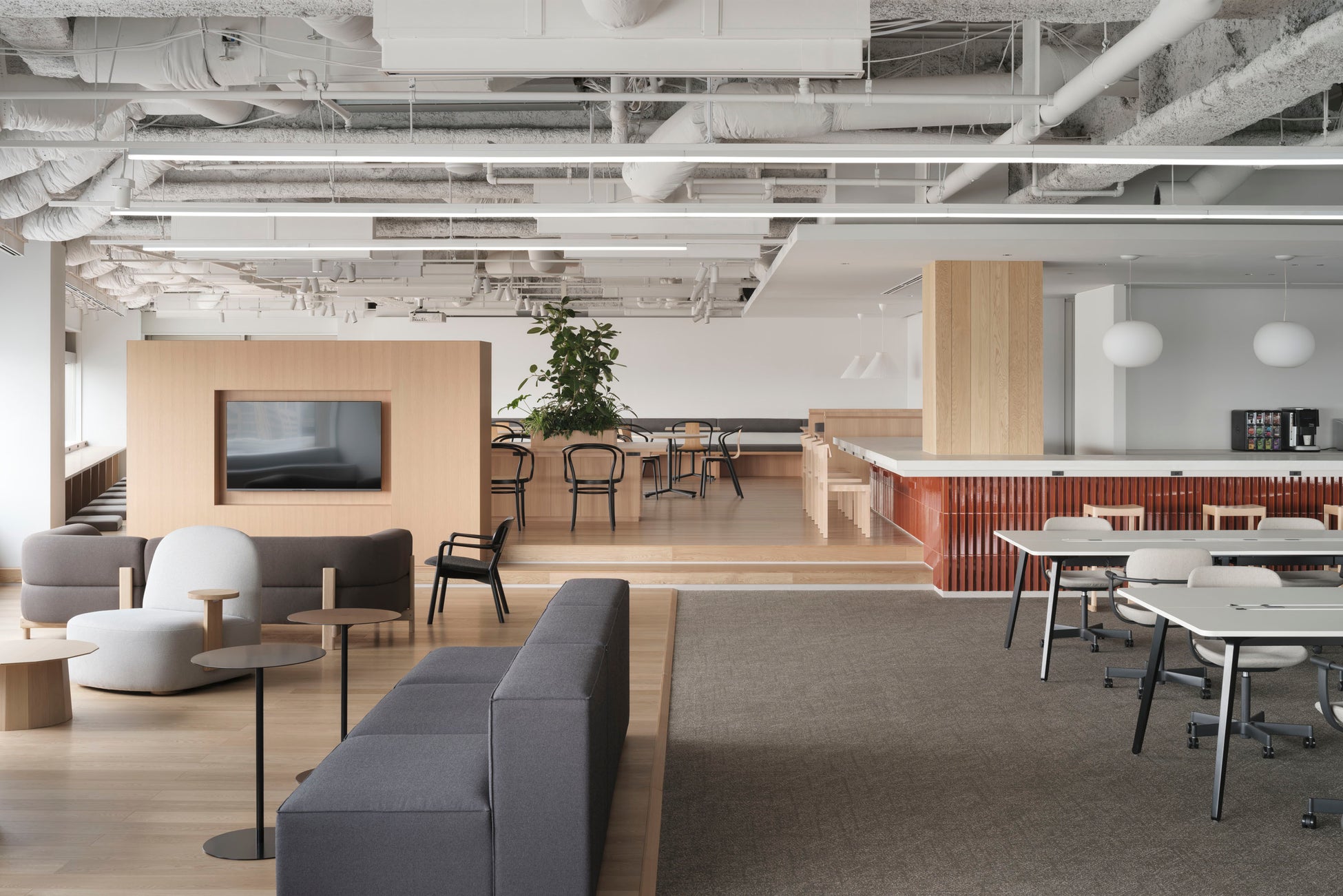 チームでの共同作業や協働を促す「COMMUNAL」とランチやパーティーができる「LOUNGE」スペースなどカジュアルなコミュニケーションができるようなデザインとなっています。複数人で作業ができるようなテーブルの設置や入り口からフロアの奥に向かって床の高さが上がっていくスキップフロアが取り入れられており、ON/OFFの切り替えのスイッチにもなります。フロアの中心に設置されたカウンターは、社内の対面コミュニケーションが活性化される象徴となっており、カウンターや「LOUNGE」スペースでのミーティング、社内外向け勉強会や社内コミュニケーション施策などさまざまな用途で利用できる空間として、活用を検討していく予定です。