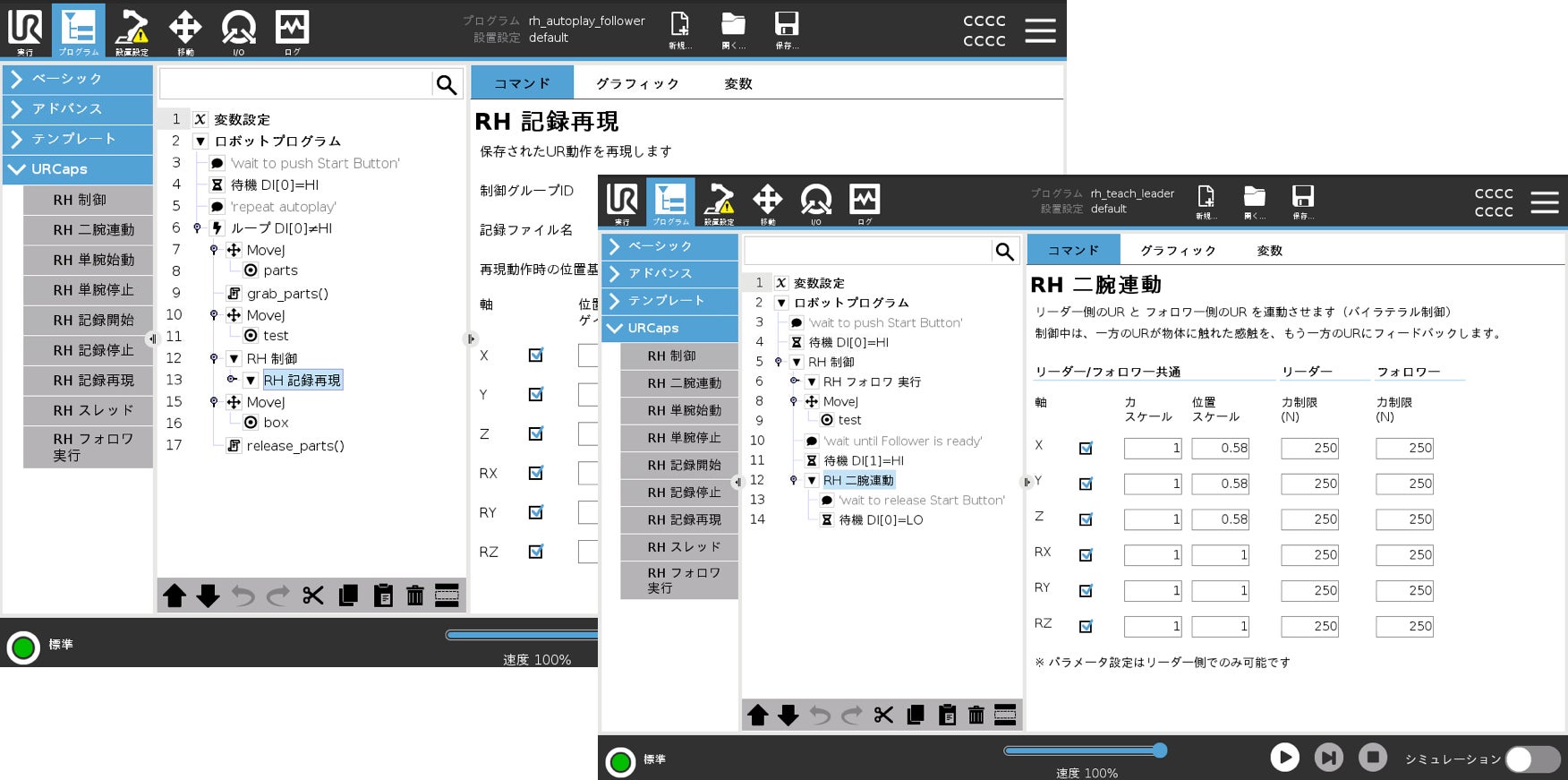 URロボット1台で動作の記録と自動実行ができるようになるオプションです。ロボットに直接触れて動作を教えることで力触覚も含めて記録でき、やさしく接触する、相手の形状に合わせる、等の動作を簡単に作ることができます。言語化の難しい”匠の技”も動作としてデータ化することでロボットに覚えさせることが可能です。