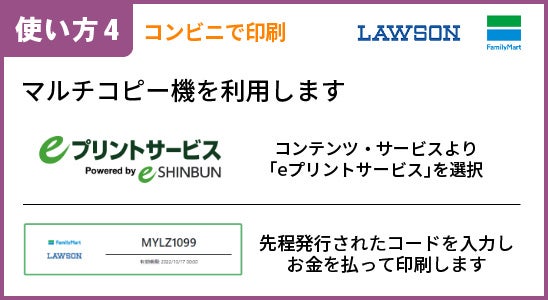 コンビニのマルチコピー機から「コンテンツサービス」⇒「eプリントサービス」⇒「番号入力」の順に操作し、料金を投入することで『マイ千社札シール』が印刷されます。