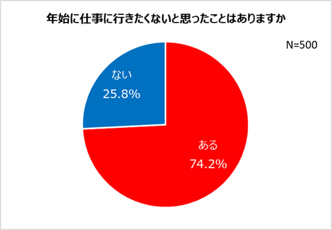 まず、年末年始の連休前のやる気について調査しました。年始に仕事に行きたくないと思ったことがあるかを聞くと、7割以上の人が「ある(74.2%)」と回答しました。