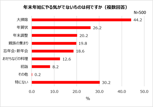 連休が楽しみな年末年始ですが、何かと忙しい時期でもあります。年末年始にやる気が出ないものを調査すると、1位は「大掃除(44.2%)」でした。会社員にとって、年末最後の大仕事は大掃除なのかもしれません。2位は「年賀状(26.2%)」で、「親族の集まり(19.8%)」や「忘年会・新年会(18.6%)」を抑えて、3位は「年末調整(20.2%)」でした。毎年訪れる大掃除や年賀状。やらなくては、と思えば思うほど腰が重くなり、つい後回しにしてしまいがちです。「サクッと取り掛かりたいけど、最初の一歩が動けない」という方も多いのではないでしょうか。