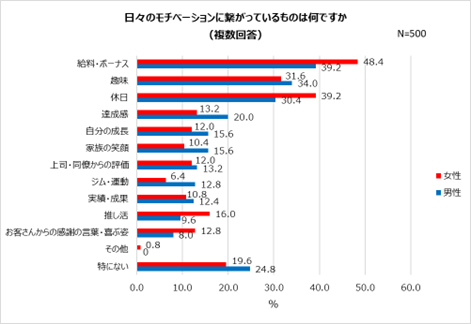 2.モチベーションに繋がるものは「給料・ボーナス」が最多。男性は「達成感」、女性は「推し活」で男女差も