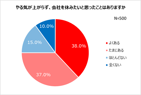 また、やる気が上がらず、会社を休みたいと思ったことがあるか聞いてみたところ、「よくある(38.0%)」と回答した人は約4割でした。「たまにある(37.0%)」と合わせると75.0%もの人が、普段から会社を休みたいと思った経験があるようです。