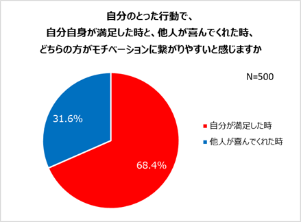 まず、自分のとった行動で自分自身が満足した時と、他人が喜んでくれた時で、どちらの方がモチベーションに繋がりやすいかを聞きました。その結果、約7割が「自分が満足した時(68.4%)」と回答。具体的に日々のモチベーションに繋がっているものを調査すると、男女ともに「給料・ボーナス」が最多でした。「休日」や「趣味」の割合も高く、自分のプライベート時間を確保する意見が多く見られました。次に多かったのは、男性は「達成感(20.0%)」、女性は「推し活(16.0%)」でした。
