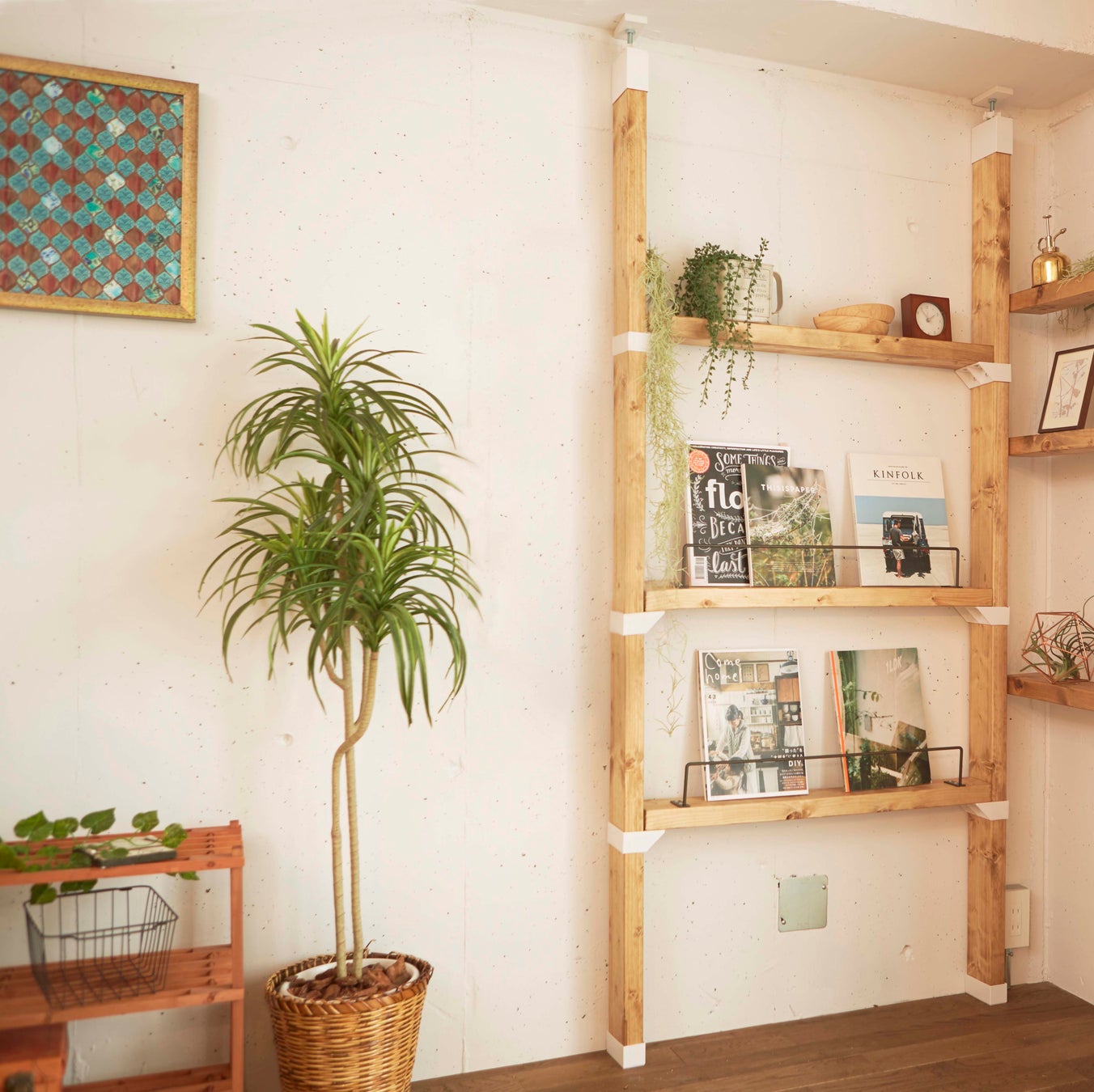 立てた柱に様々なパーツをねじ留めすることで、省スペースで収納を作ることができます。