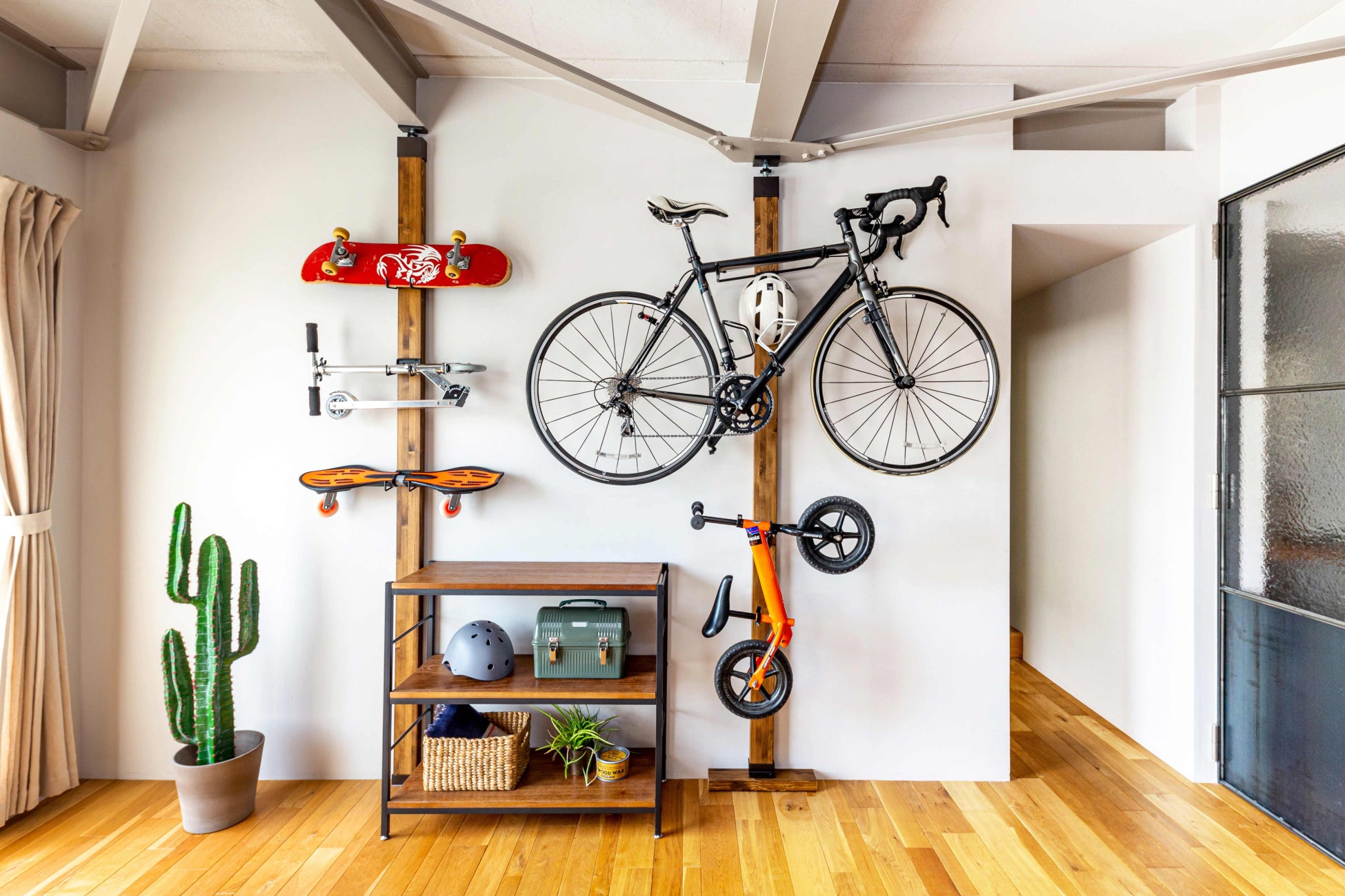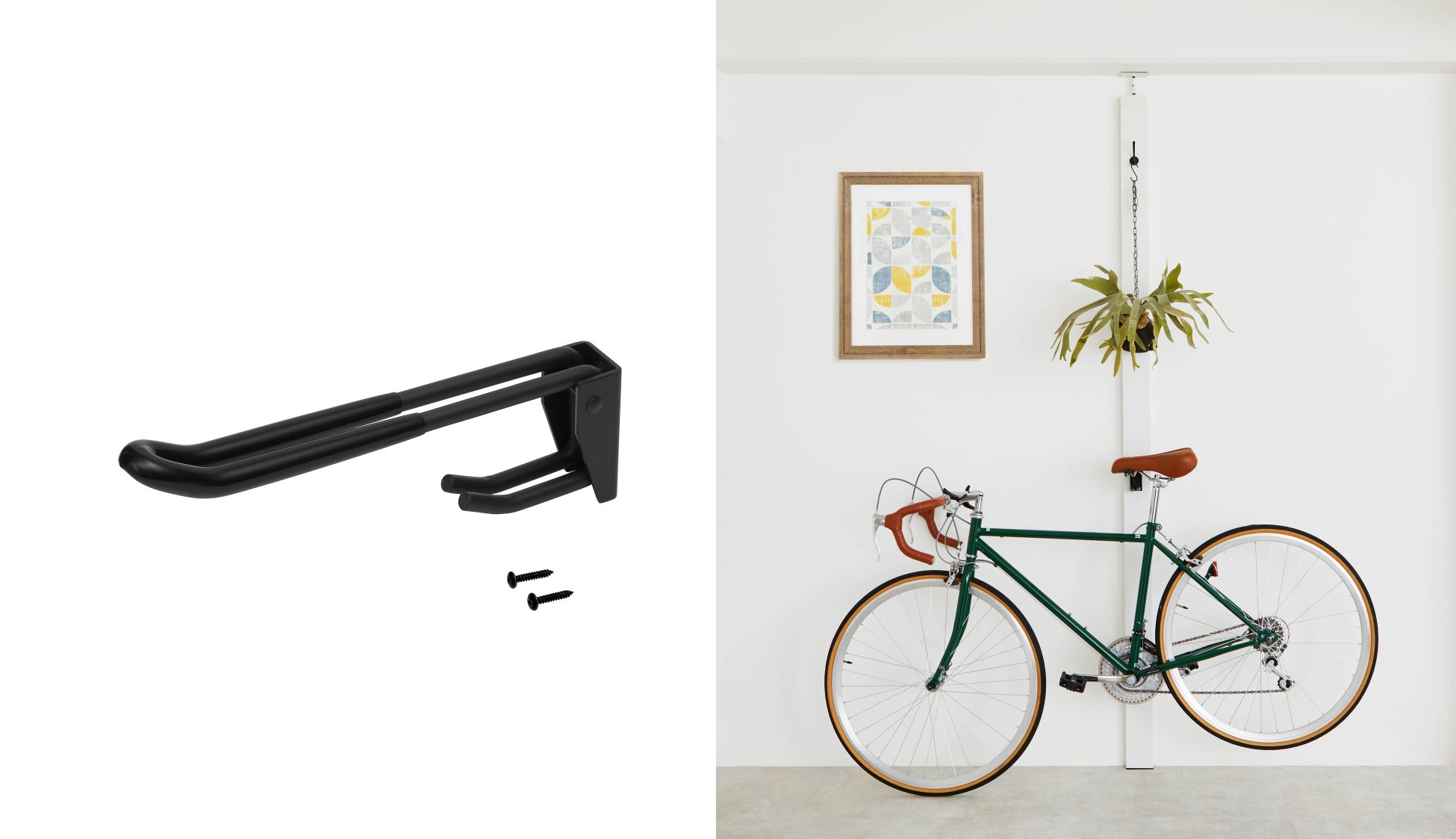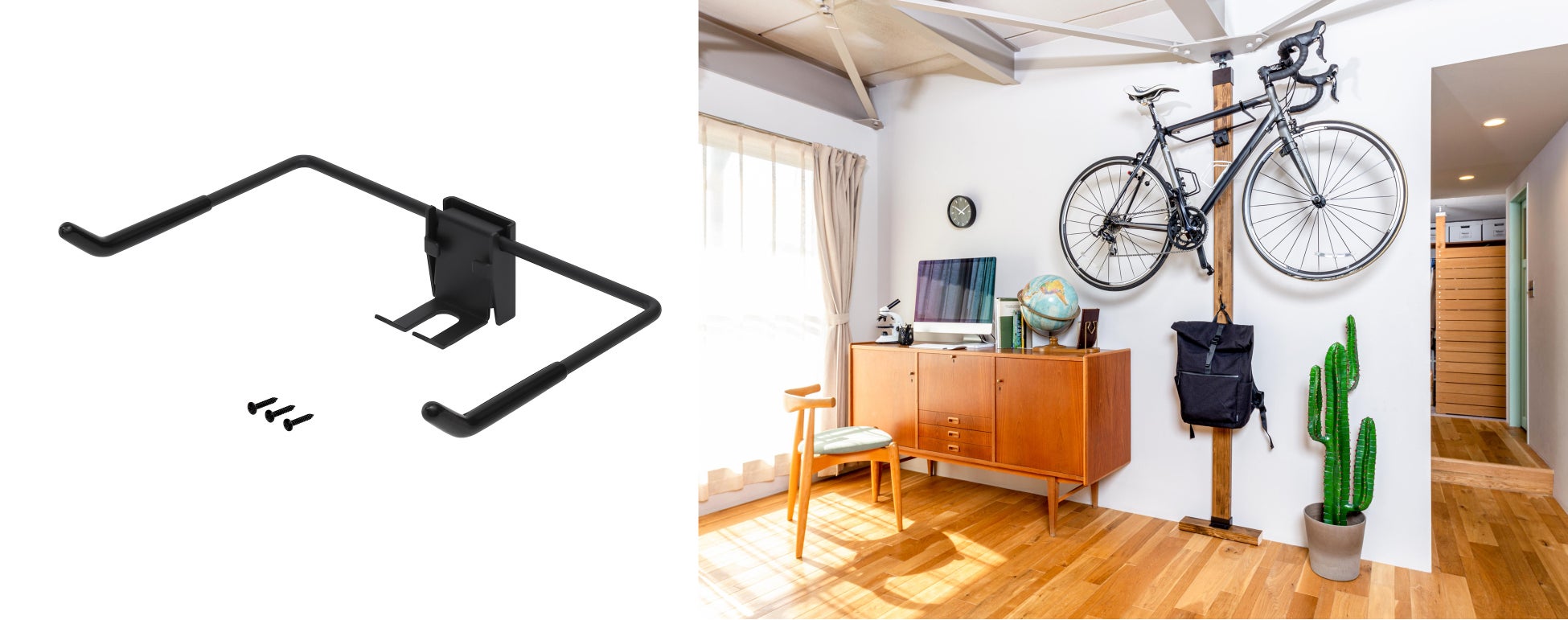 ラブリコアジャスター※を使用して、天井から床に立てた柱に取り付けることで賃貸物件でも天井や壁面を傷付けずにロードバイクを壁掛け収納できるパーツです。