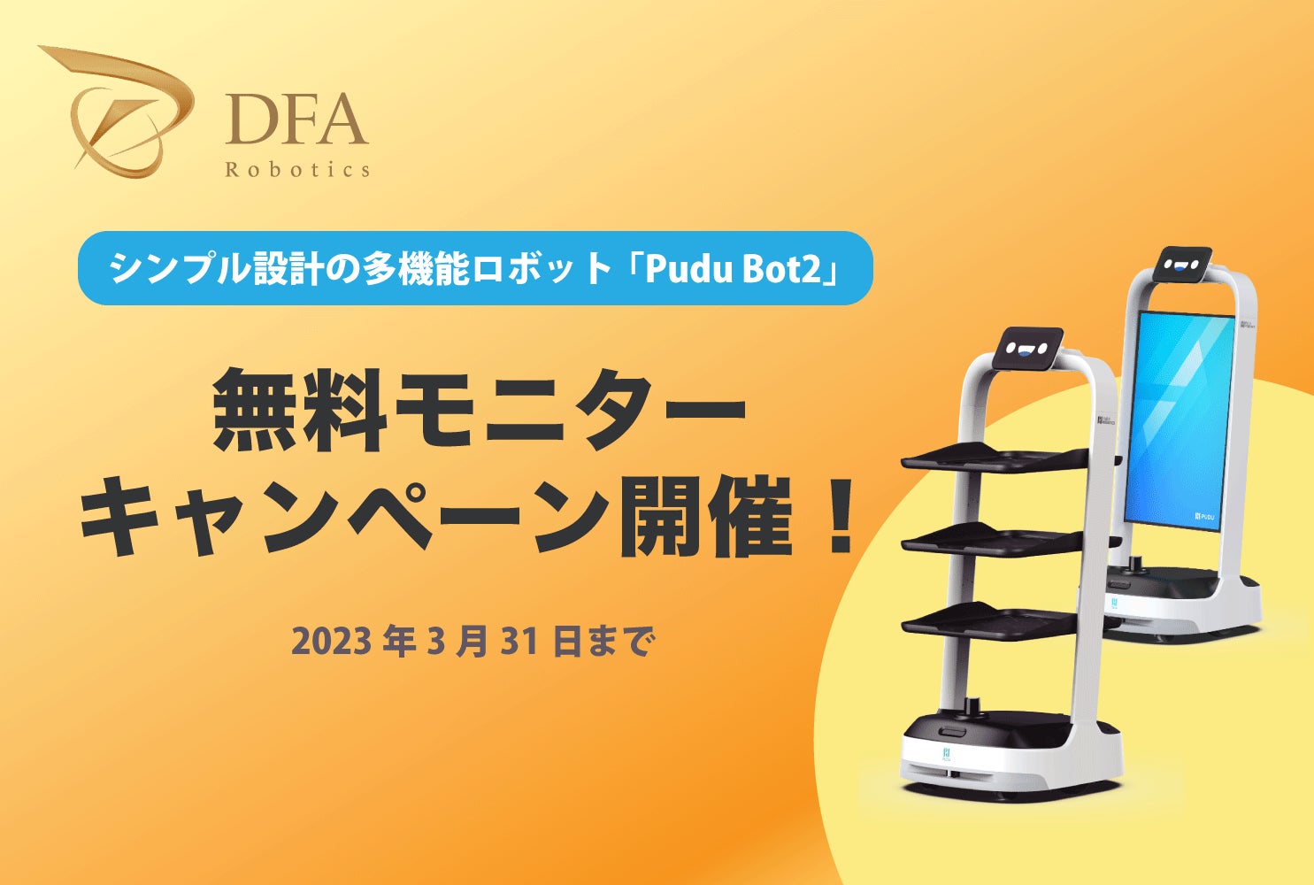 飲食店DXを推進するロボティクスソリューションカンパニーである株式会社DFA Robotics(本社:東京都渋谷区恵比寿 代表取締役:波多野昌昭)は、提携するPudu Robotics社(本社:中国深セン、日本法人Pudu Robotics Japan 株式会社 代表取締役社長:張涛)が提供するシンプル設計の多機能ロボット「Pudu Bot2(プードゥーボットツー)」の取り扱いを開始いたしました。これを記念し、「Pudu Bot2」テスト導入 無料モニターキャンペーンを、サービスロボット導入を検討する企業のみなさまを対象に実施いたします。