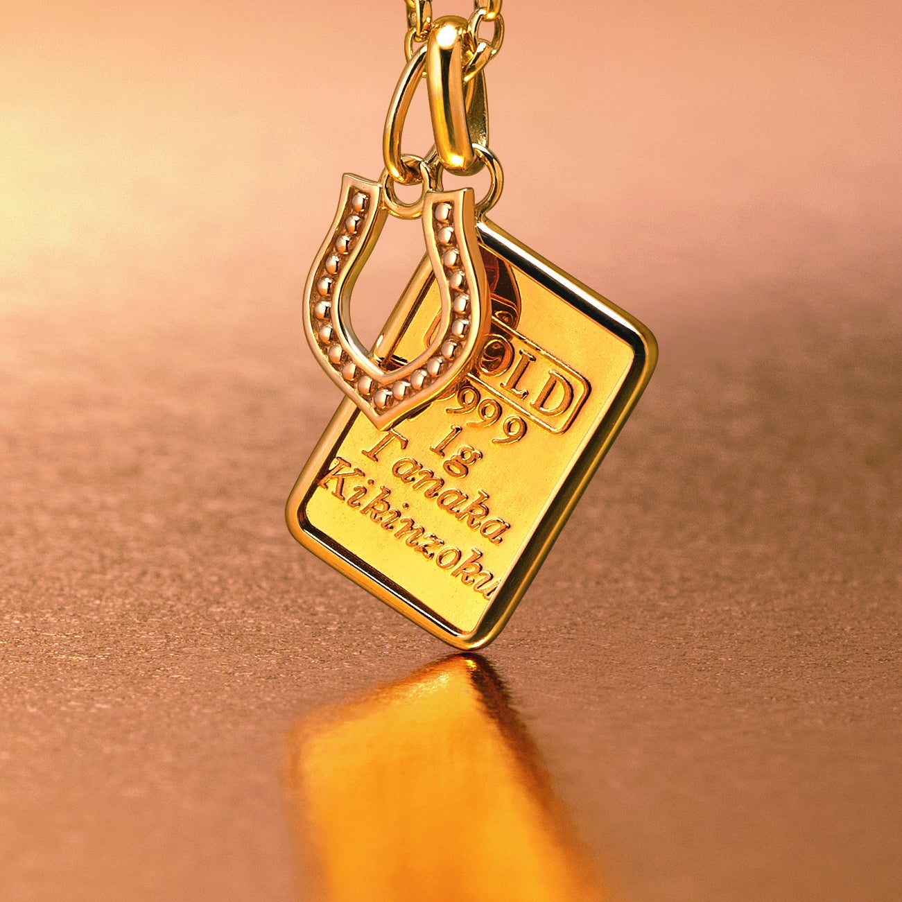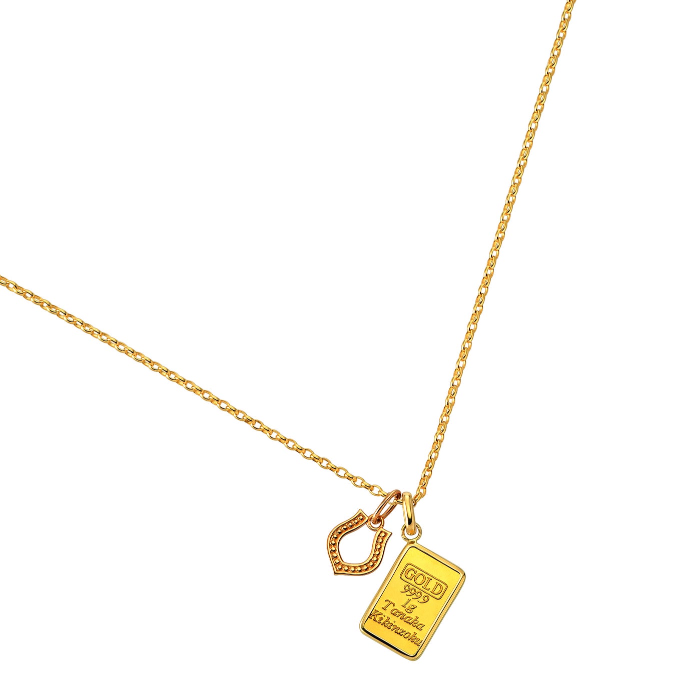 純金1gコインバーペンダント K18馬蹄型チャーム付は、田中貴金属が純度99.99%を保証する純金製1gコインバーと人気のラッキーモチーフである馬蹄型チャームをセットしたダブルペンダントです。1gコインバーに合せたK18製の馬蹄デザインのチャームは「幸運を受けとめる」という意味をもつラッキーモチーフで、セットはもちろん、ひとつずつまたは、お手持ちの長さの異なるチェーンとレイヤードスタイルでも着用できる万能なアイテムです。