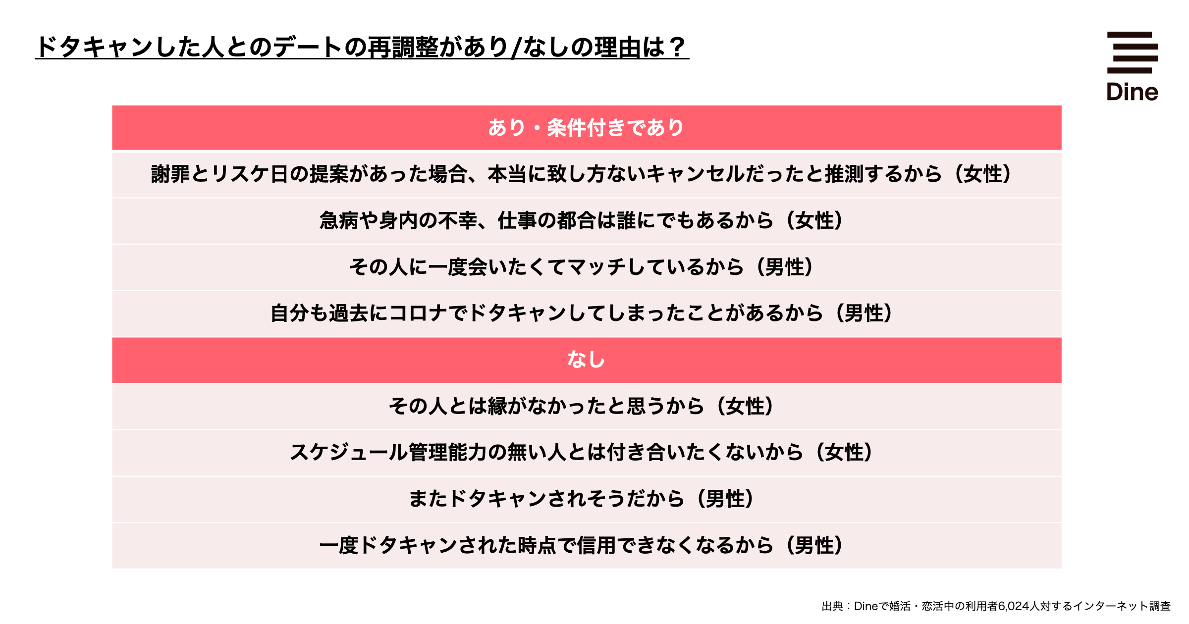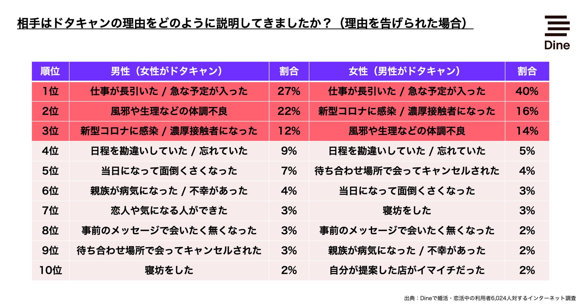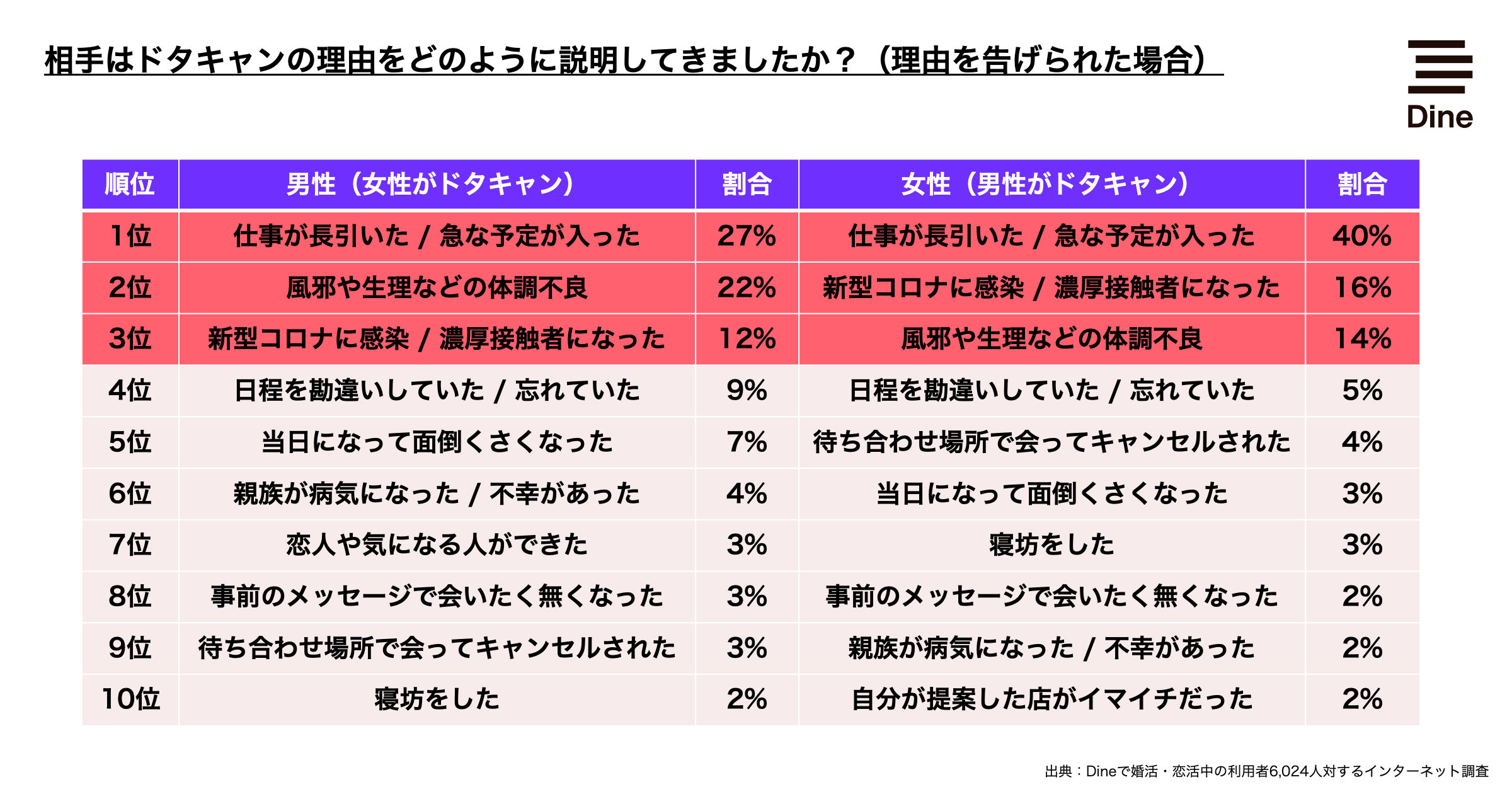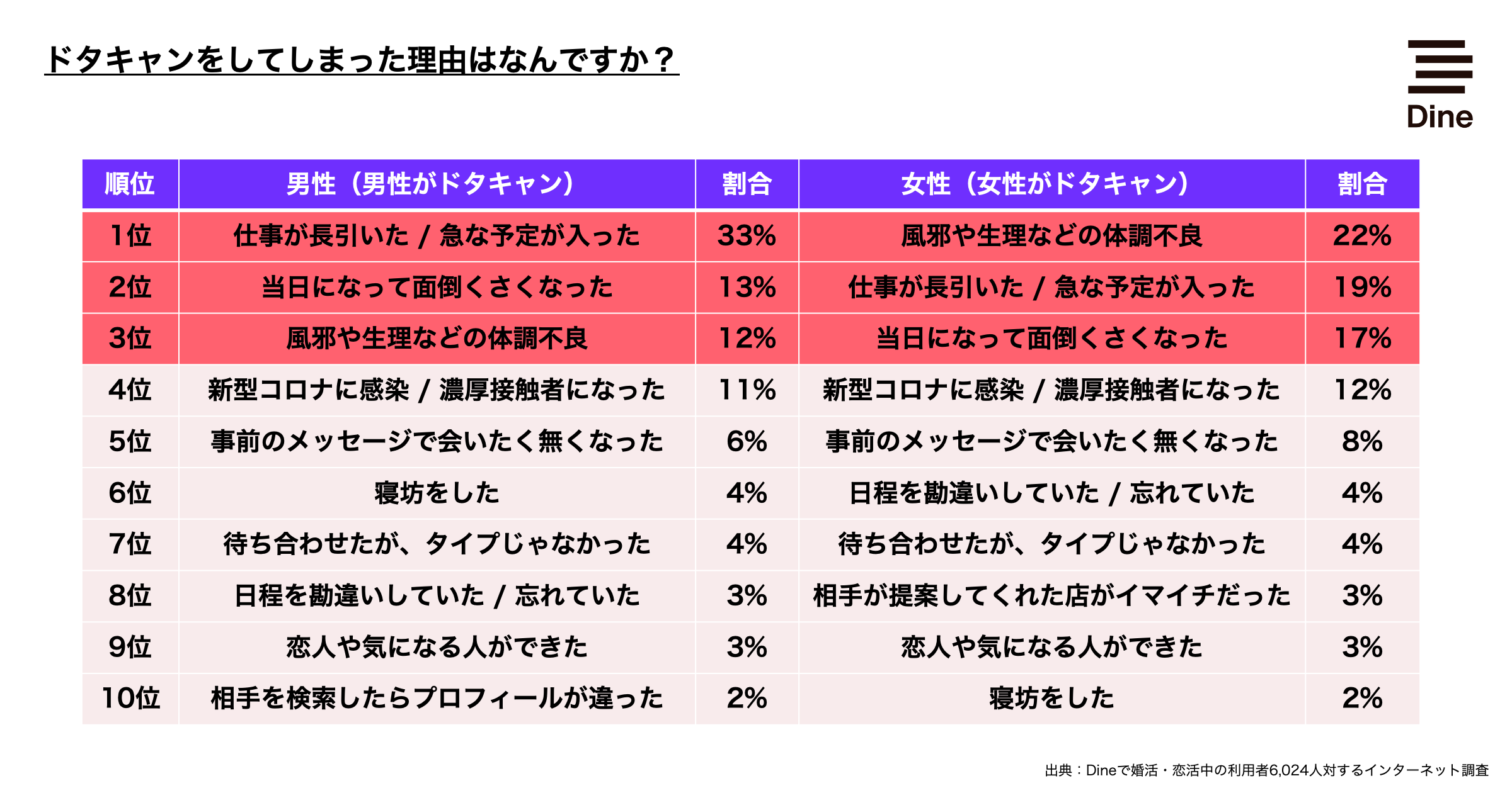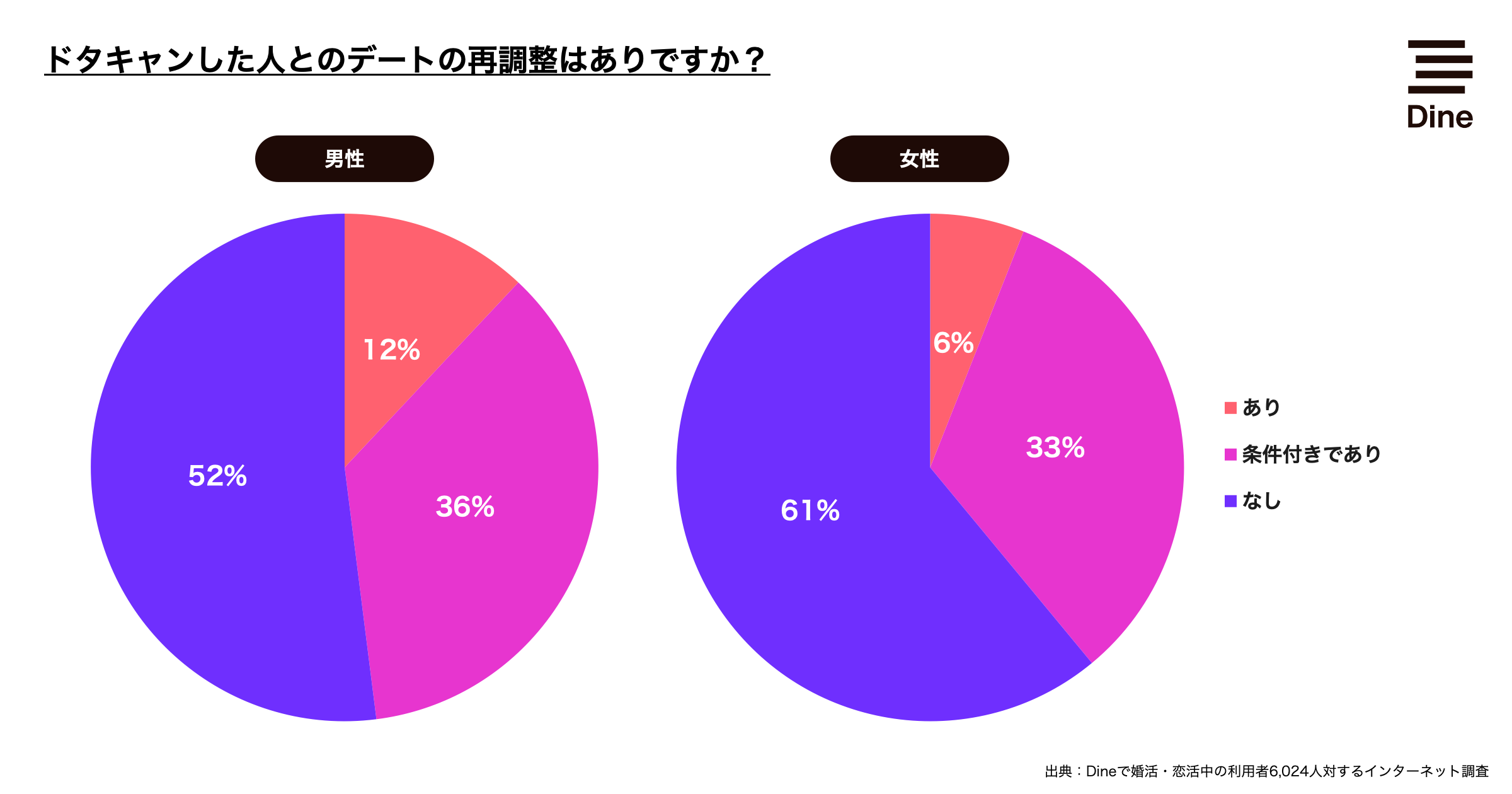婚活・恋活マッチングアプリ「Dine(ダイン)」が、ドタキャンに関するアンケート調査を実施