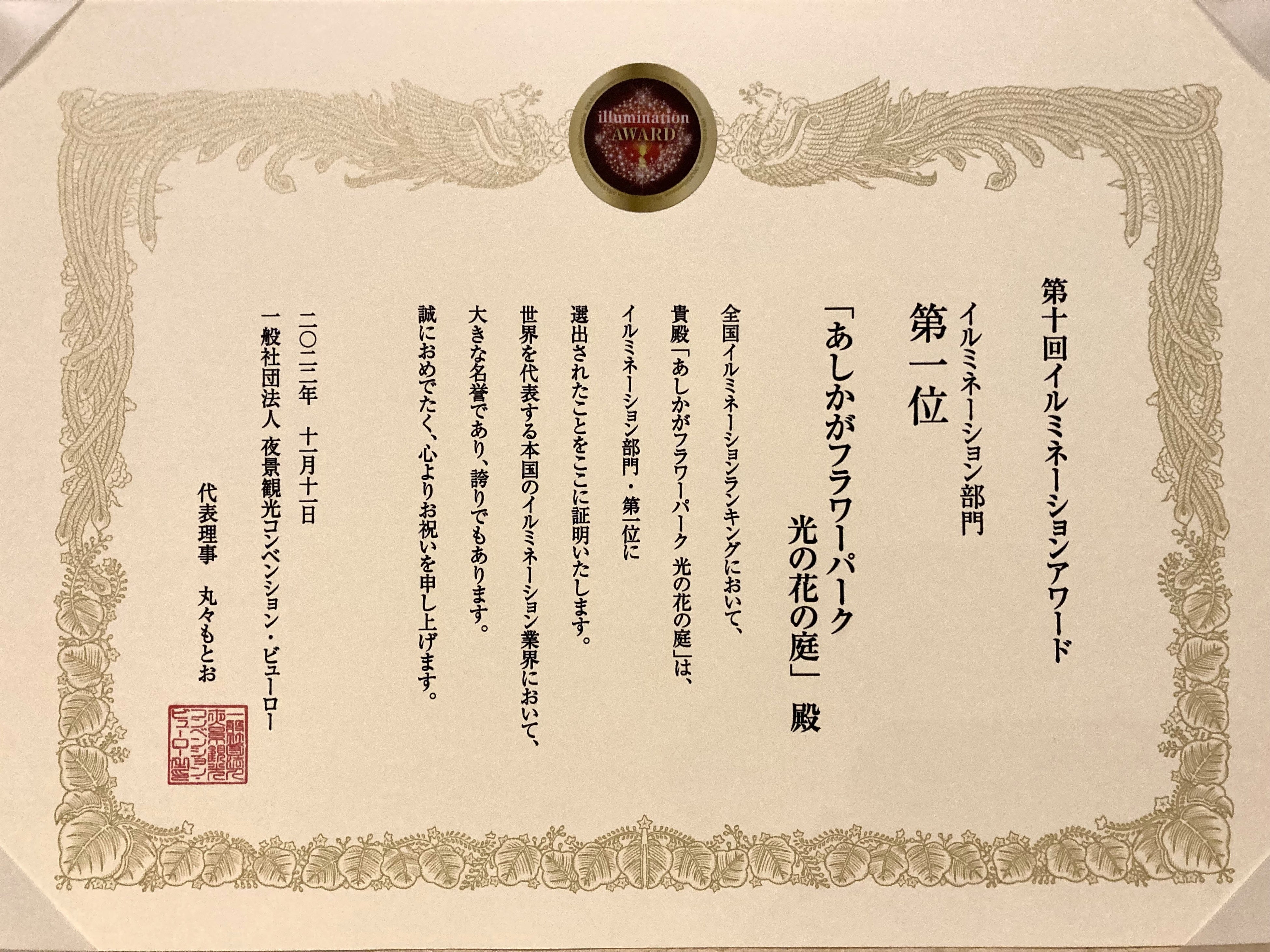 (株)足利フラワーリゾート(本社 栃木県足利市田中町906-13 代表 早川公一郎)が運営を行う、あしかがフラワーパークは、(一社)夜景観光コンベンション・ビューロー(代表理事:丸々もとお)が主催する『第十回イルミネーションアワード』授賞式において7年連続でイルミネーション部門ランキング全国第1位を獲得いたしました。
