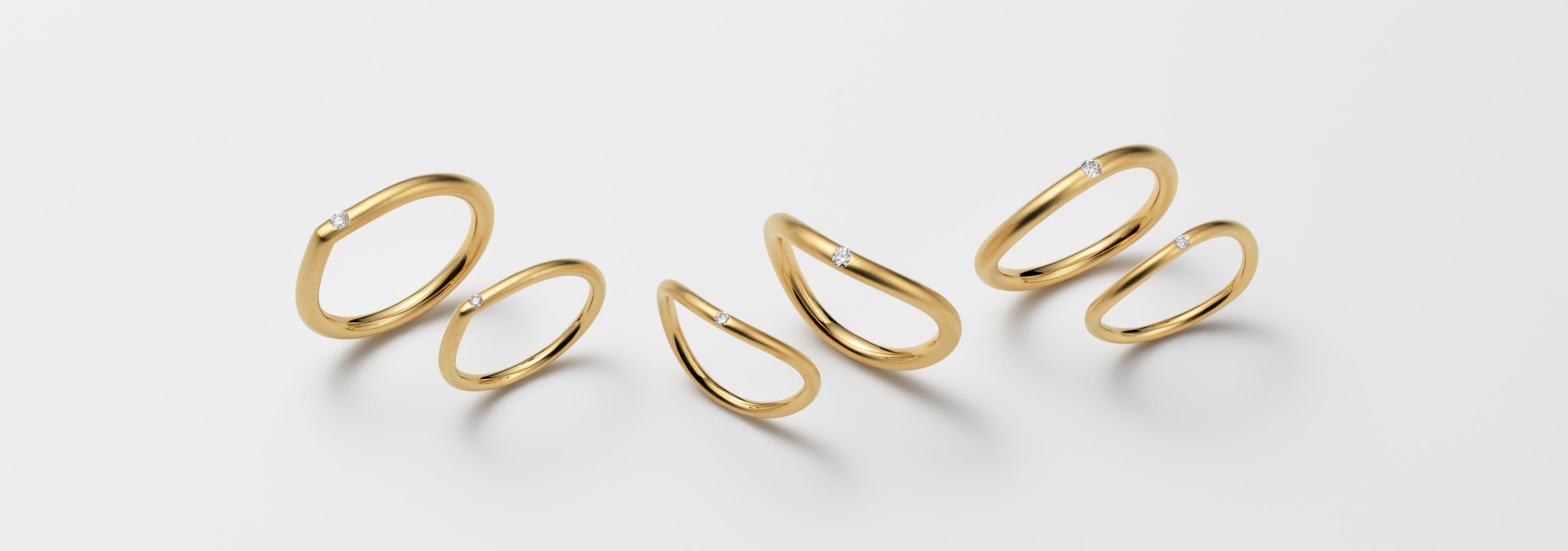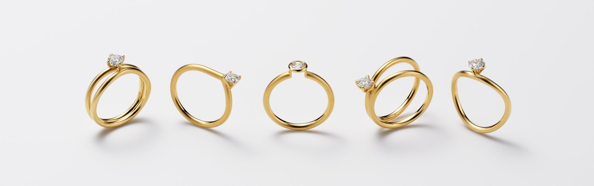 丸い石枠にダイヤを留めたグローブセッティングや、長い爪先でダイヤを支えるコンパスセッティング、手元から浮かせてシルエットを見せるフロートベゼルセッティングを用い、海底ダイヤモンド自体が最大限際立つよう意識。地金は従来の形式にとらわれない自由な形状で、薬指に限らず、好きな指に着けて楽しめるデザイン。リファインゴールドは、海の波に洗われたシーグラス(漂流ガラス)のように、艶感を含んだマット加工が優しく、ダイヤモンドの鮮やかな輝きとのコントラストを楽しんで頂けます。海で生まれたダイヤに思いを馳せることができるブライダルジュエリーです