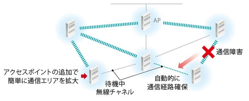通信経路のどこかで障害が発生しても、自動的に最適な代替経路を確保して通信接続を維持するなど、障害に強いネットワークを構築できます。アクセスポイント間も無線接続であるため、アクセスポイントを増やすだけで簡単に通信エリアを広げることができます。