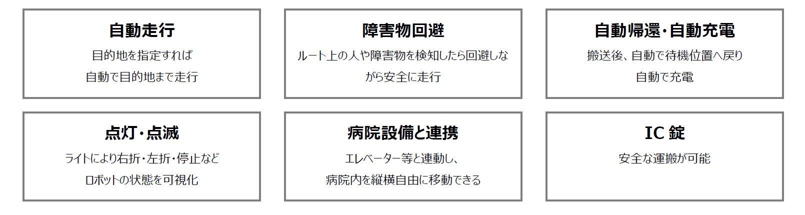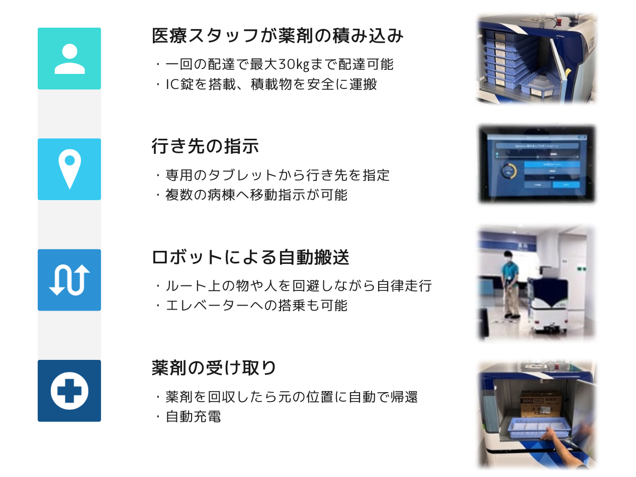 薬剤をはじめ、輸液・検体・書類など病院内の様々な物品を運ぶことができる、運搬ロボット。