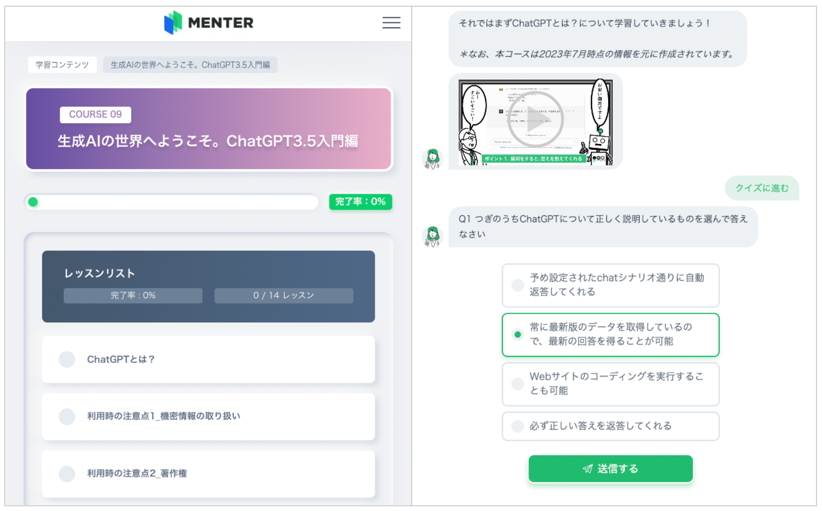 弊社のDX人材育成サービス「MENTER」でも“生成AIの世界へようこそ。ChatGPT3.5入門編”というコースを有してますが、使いこなすために必要な周辺ITリテラシー教育を用意しています。また、ChatGPT3.5をAPI経由でサービス提供しているので、より広く使いこなすことのできる人材育成が可能です。
