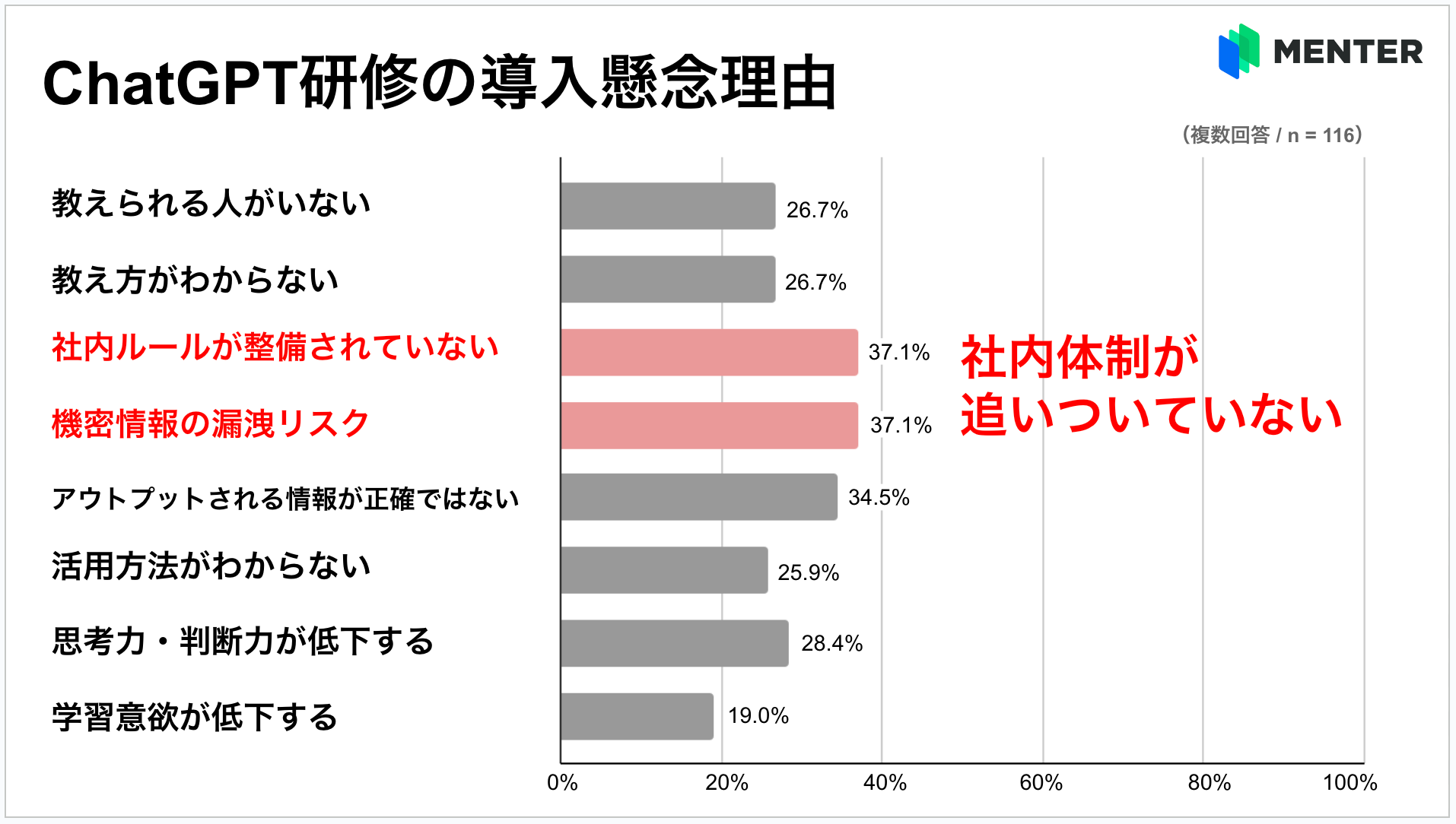 (3)導入を懸念する理由、同率1位は「機密情報の漏洩リスク」と「社内ルールの未整備」。「アウトプットされる情報の正確性」を疑問視することも明らかに