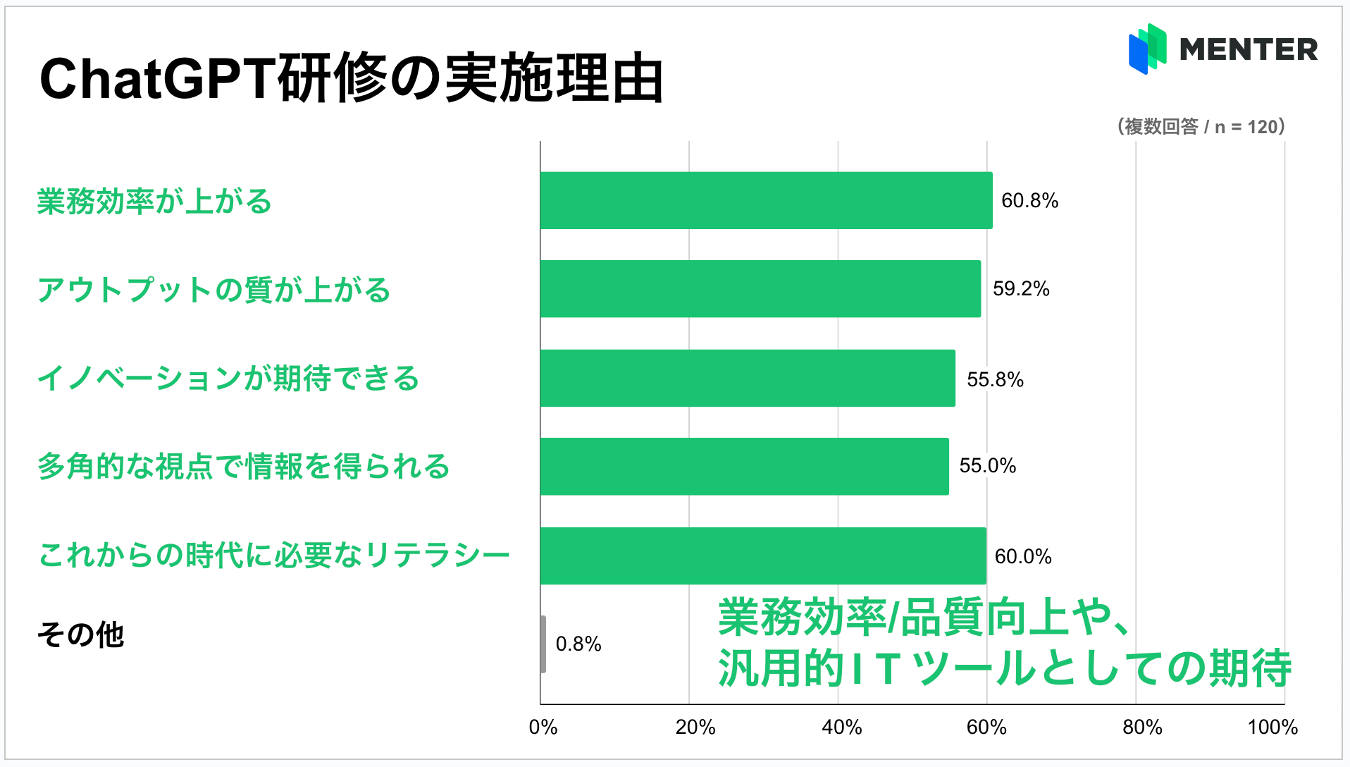 ChatGPT研修を予定していると回答した方に、その理由を尋ねたところ、「業務効率の向上」が60.8%と最も多く、「これからの時代に必要なリテラシー」(60.0%)、「アウトプットの質向上」(59.2%)が続く結果になりました。