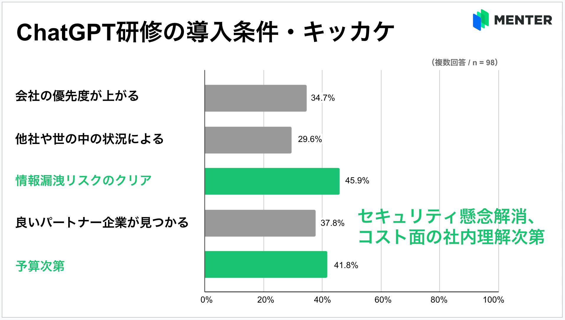 ChatGPT研修を“検討中”の企業に対して、導入条件やキッカケが何かについて尋ねたところ、約半数となる45.9%が「機密情報の漏洩リスクがクリア」されれば導入したいと回答し、前述と同様、セキュリティへの不安感が上位となりました。ついで、「予算がつけば導入したい」(41.8%)といったコスト面での社内理解のほか、「良いパートナー企業がいれば導入したい」(37.8%)といったことも必須条件と言えそうです。