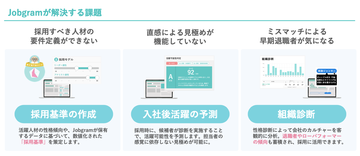 Jobgramは、高精度の性格診断とスキルチェックテストによって、職種ごと・業種ごとの入社後活躍を予測し、採用のミスマッチを防ぐ適性検査サービスです。社内メンバーの性格診断によって会社のカルチャーを分析し、採用すべき人材を定義することで、科学的な採用を実現します。