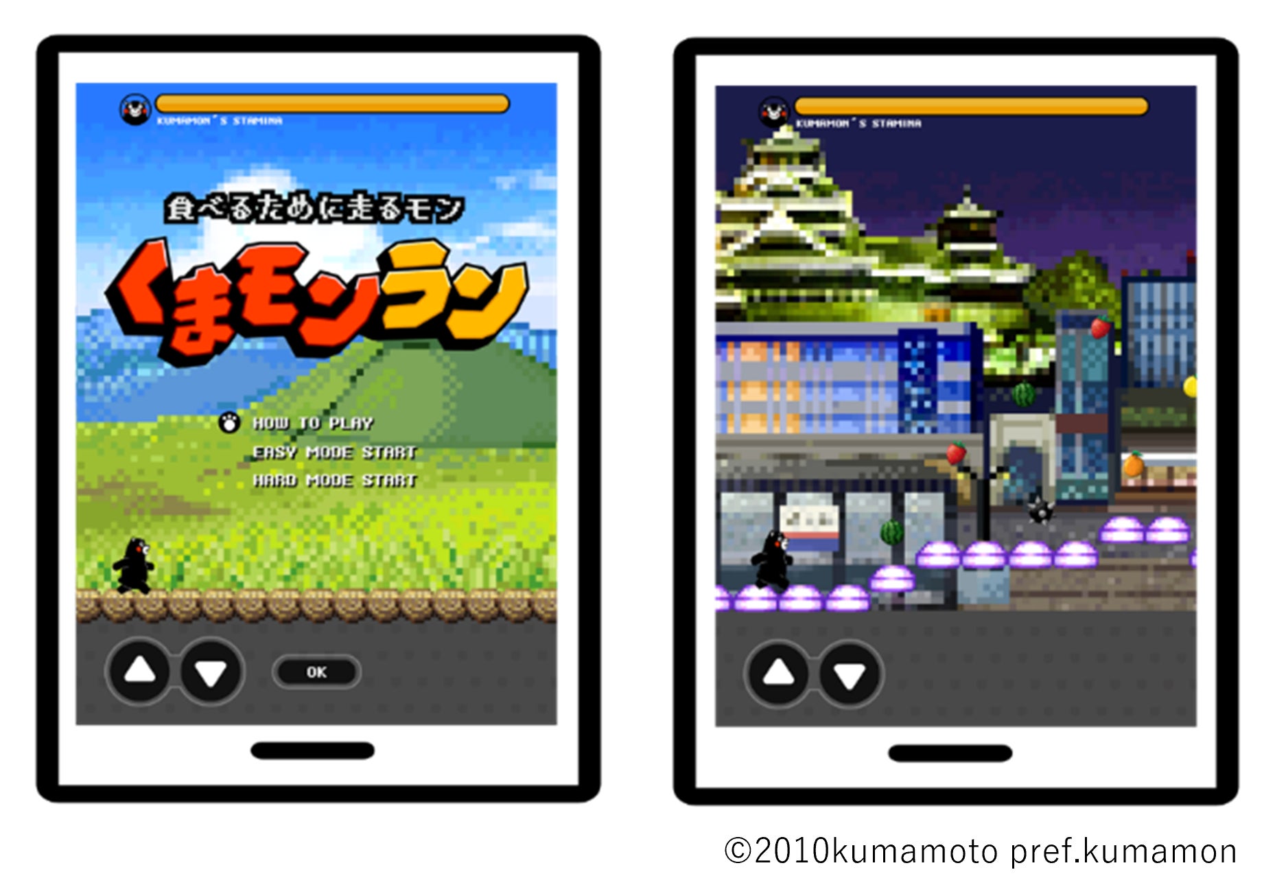 くまモンが熊本県の特産品をゲットしながら走り続けるゲームです。プレイヤーはくまモンが長く走れるよう道を上下に操作しながら熊本の名所を巡ります。いつでもどこでもくまモンに触れ合えますのでぜひご体験ください。