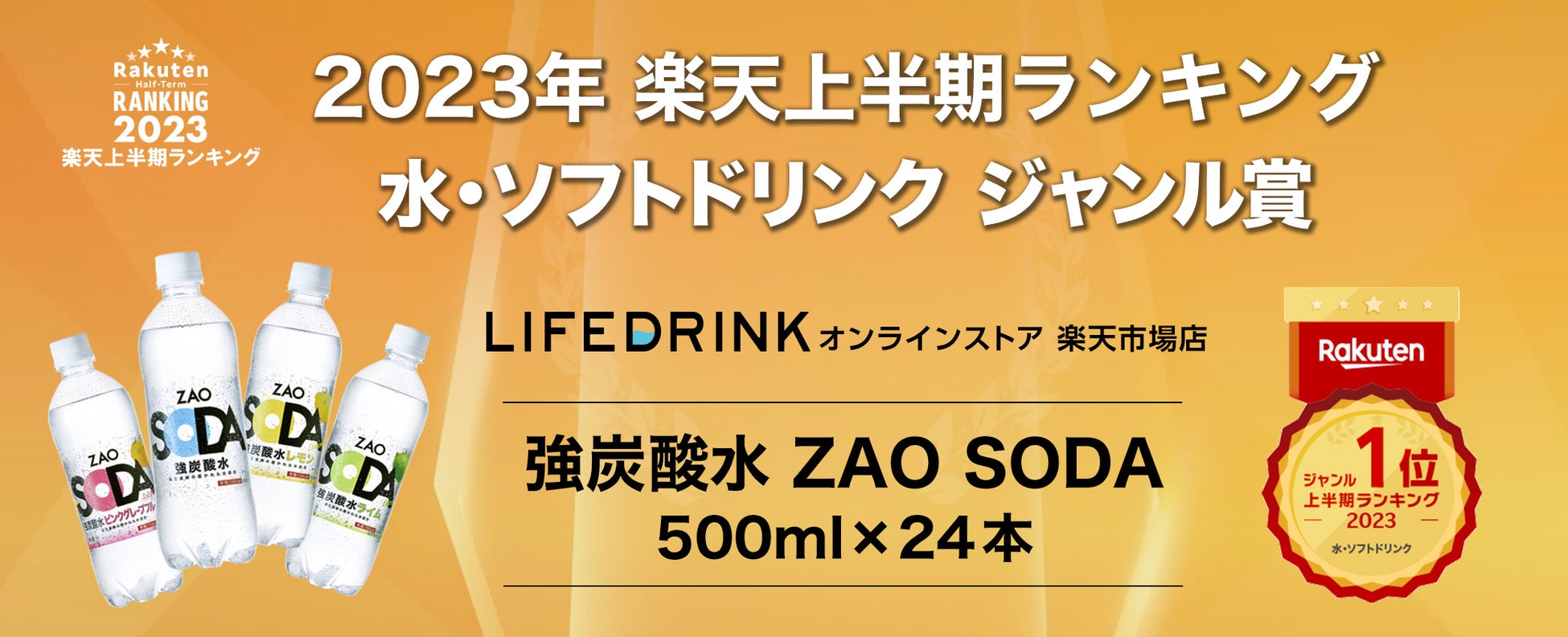 株式会社ライフドリンク カンパニー(本社:大阪府大阪市、代表取締役社長:岡野 邦昭)(以下「当社」)は、当社直営店舗「LIFEDRINKオンラインストア 楽天市場店」で販売する「強炭酸水 ZAO SODA 500ml 24本」が楽天上半期ランキング2023「水・ソフトドリンクジャンル賞(水・ソフトドリンクジャンル1位)」を受賞しましたので、お知らせいたします。