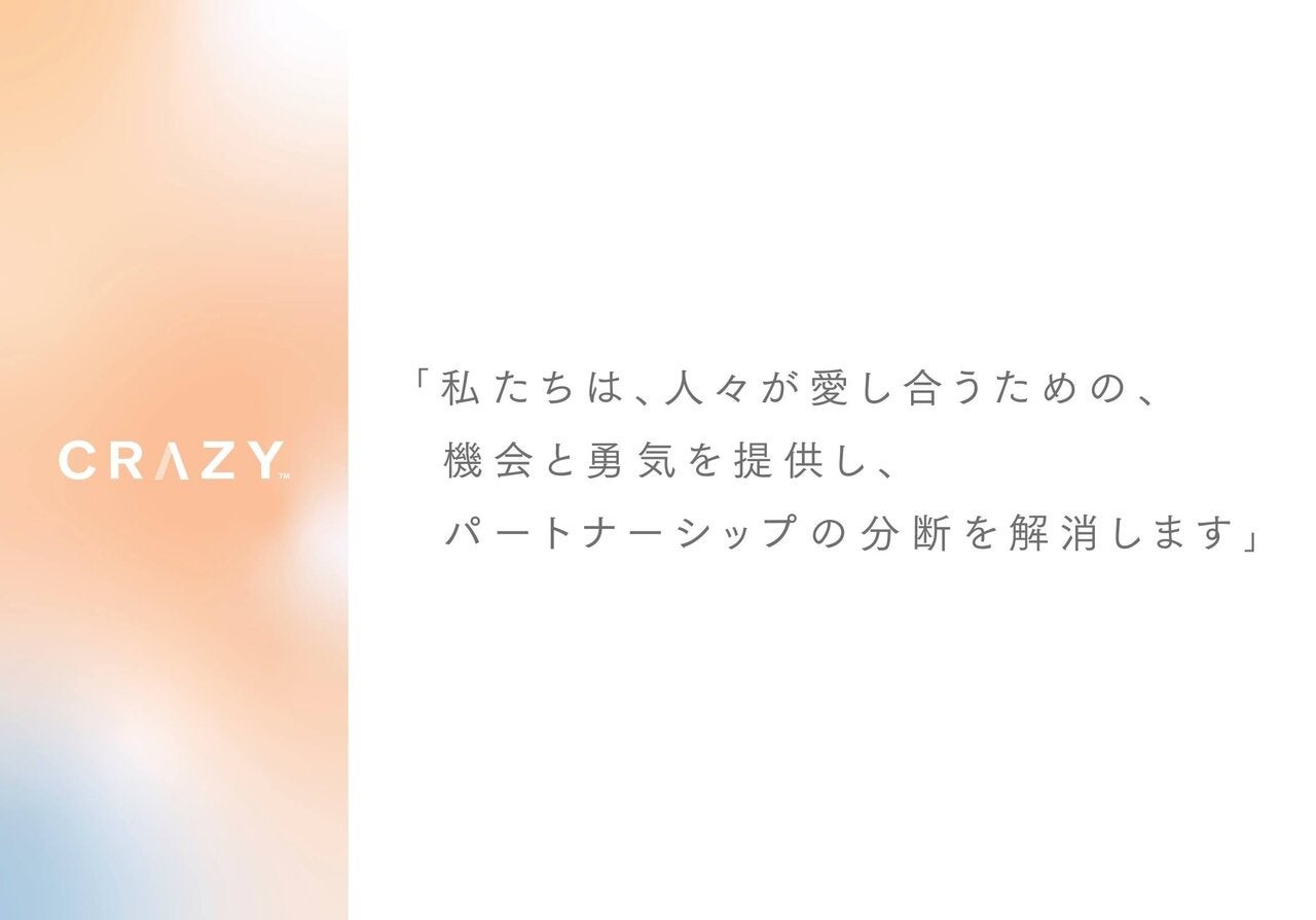 CRAZYは、「人々が愛し合うための、機会と勇気を提供し、パートナーシップの分断を解消します」をパーパスに掲げ、経営に取り組んでいます。このようなパーパスに基づいてサービスを提供するために、まず社員一人ひとりのパートナーシップを取り扱うことを大切にしています。