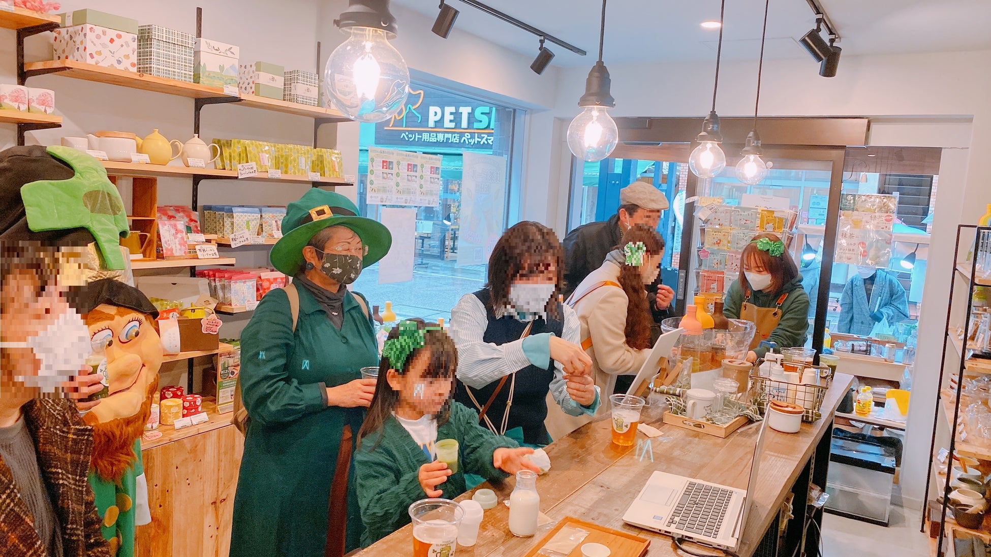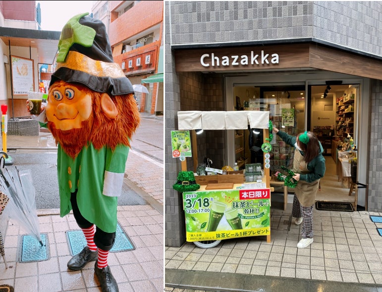戸越銀座商店街にある「茶雑菓」で店頭イベントを実施いたしました。茶雑菓では2022年12月より毎月1回抹茶に関するプレイベントを行っておりましたが、今回のセントパトリックスデーイベントでは、抹茶ビール・抹茶スカッシュの販売を始めとし、1000円以上ご購入いただいたお客様に抹茶ビールもしくは抹茶スカッシュを1杯プレゼント、緑色のものを身につけている方へ抹茶スティック1つプレゼントなどの企画を行い、雨にも関わらず多くの方々にご来店いただきました。