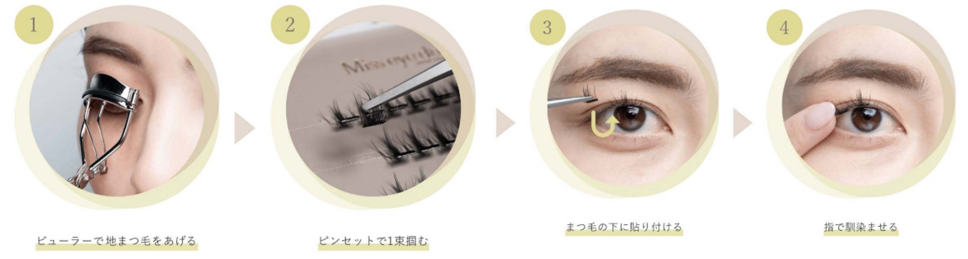 簡単かつ速い4ステップです。「ワンタッチまつエク」は必ず肌に付けず地まつ毛に装着します。これによりアレルギーがある方でも安心して使用できます。