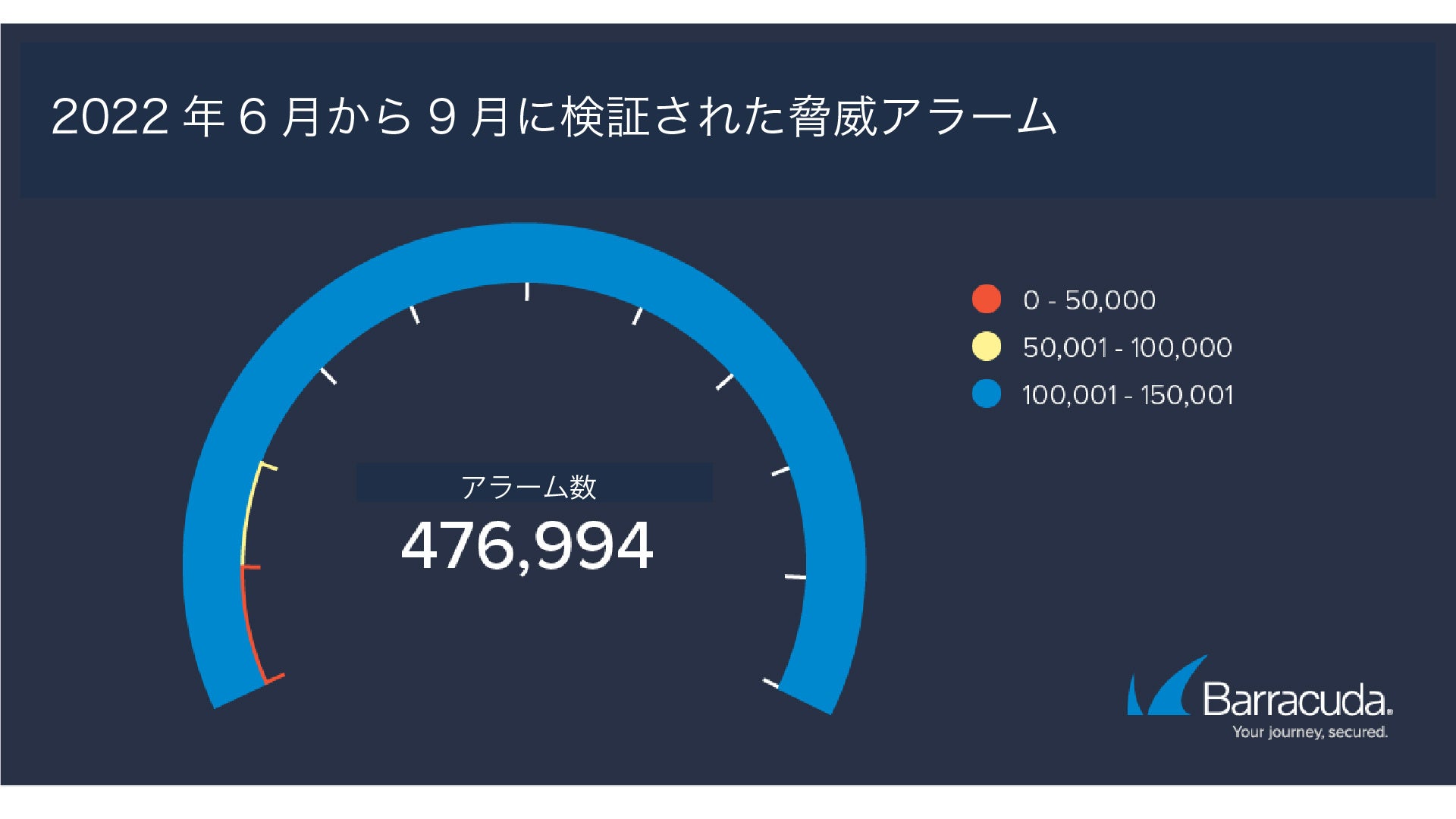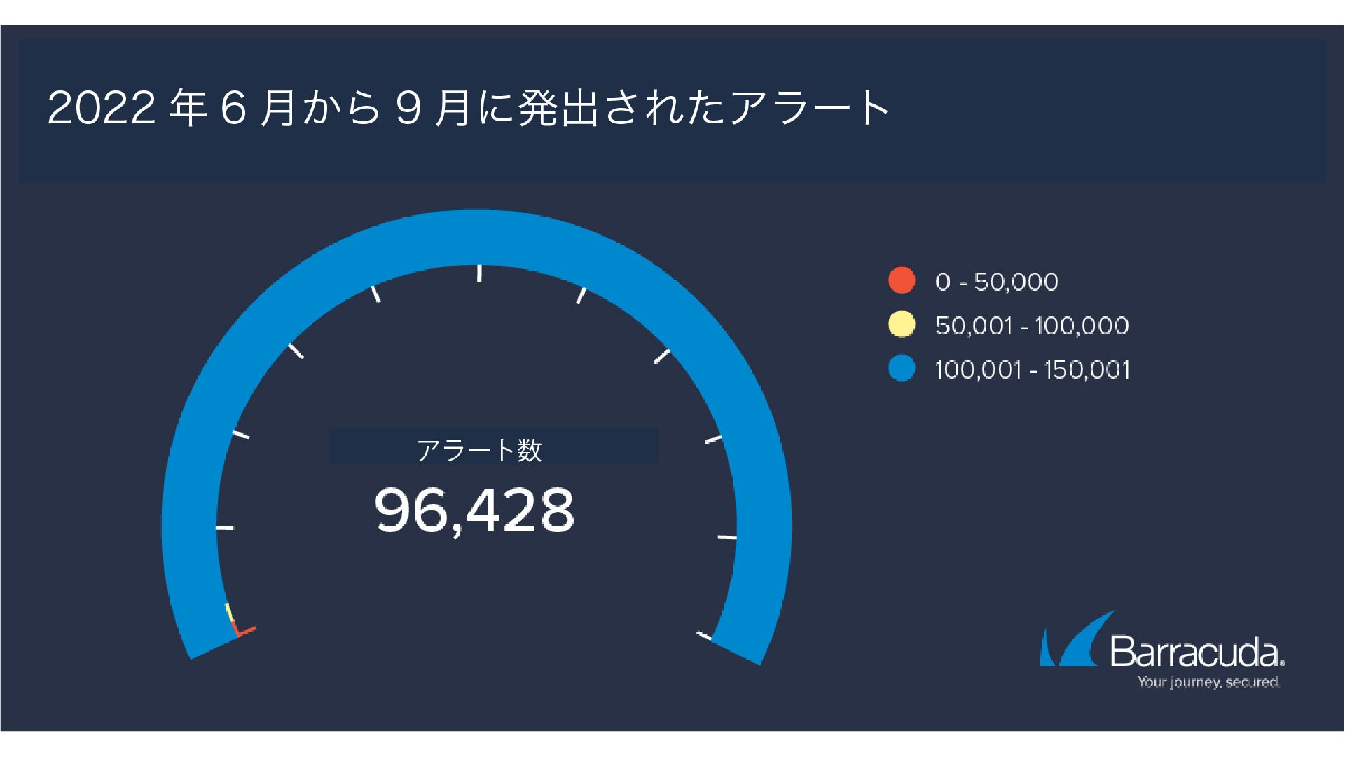 6月から9月の間にバラクーダの脅威エキスパートが分析した476,994件の脅威アラームのうち、20%にあたる96,428件は、顧客に潜在的な危険を警告し、改善策を講じるよう促すほど深刻な内容となっています。