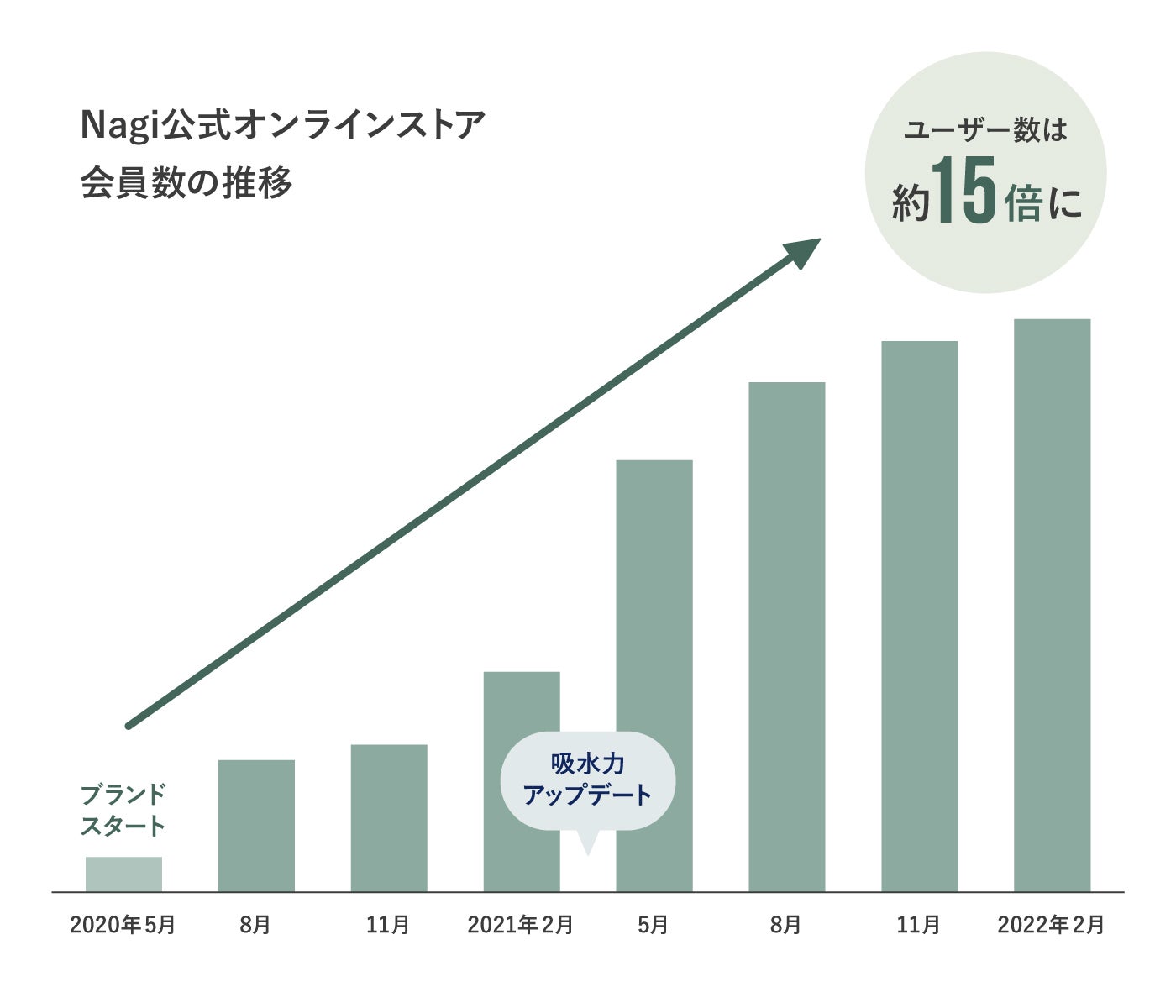 また、多くの女性たちが生理に悩んでいることと比例するように、Nagi公式オンラインストアの会員数は発売当初からおよそ1年半で約15倍へと成長いたしました。みなさんのご要望に応えるため、プロダクト改良にも積極的に取り組み、2021年3月には吸水力の大幅なアップデートも実施しています。