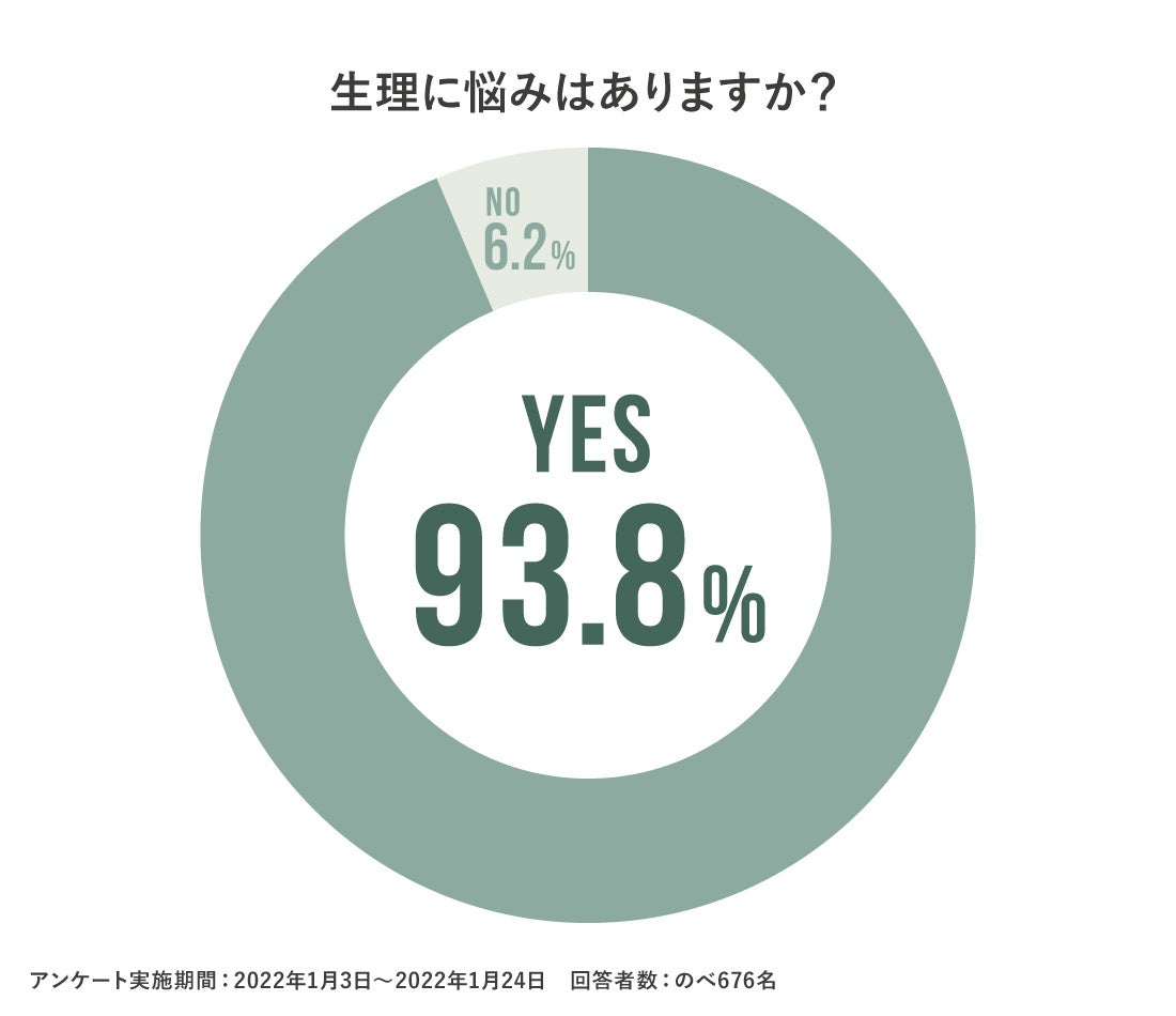 BLAST Inc.が独自に実施したアンケートでは約94%の女性たちが「生理に悩みがある」と回答しており、さまざまな技術が発達した現代においても、多くの女性たちが生理の悩みを抱えていることがわかります。
