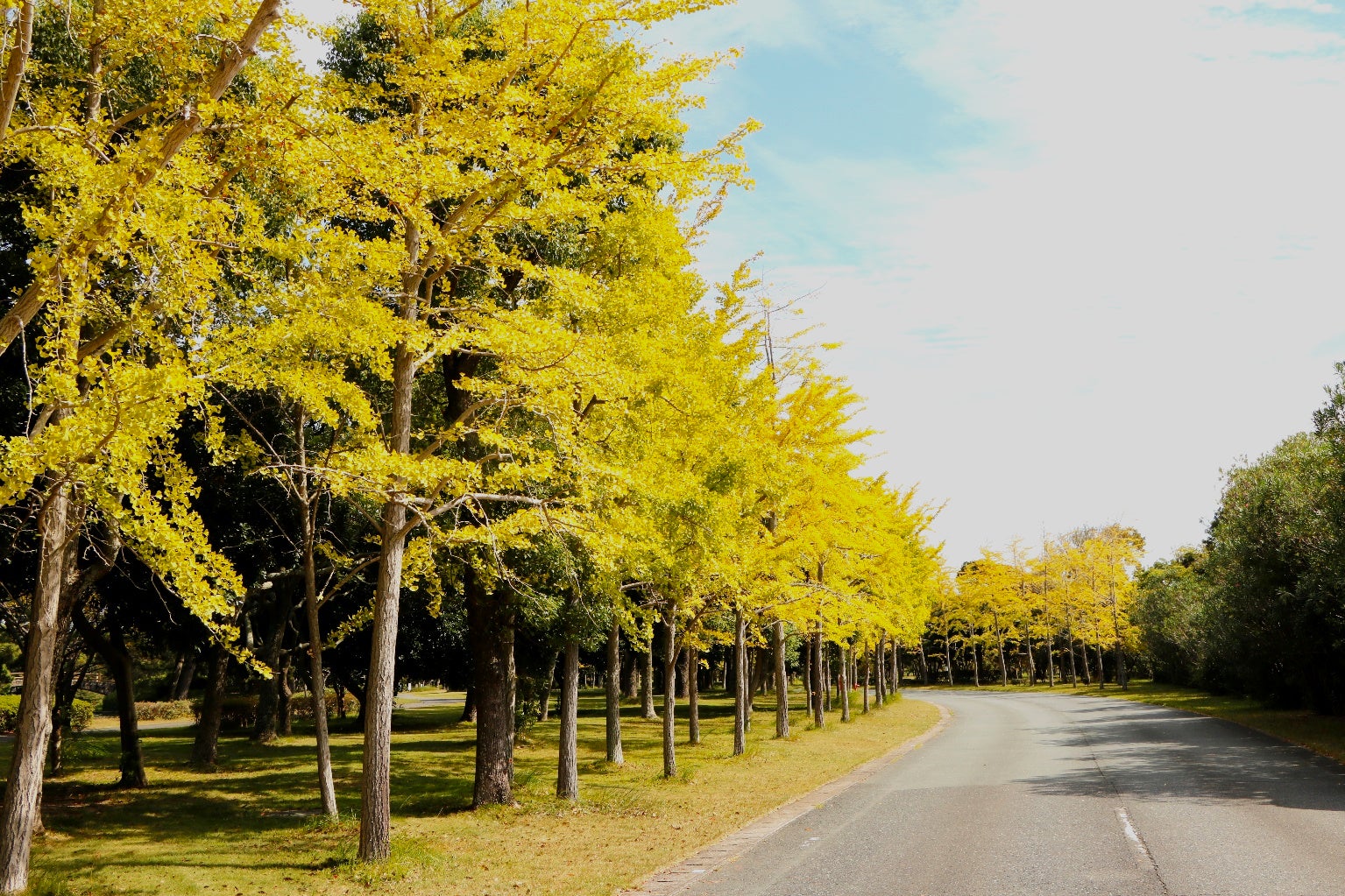 秋空に映える並木道 銀杏並木350本が黄金色(海の中道海浜公園)