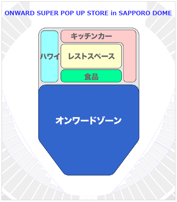「ONWARD SUPER POP UP STORE in SAPPORO DOME」では、『23区』『自由区』『ICB(アイ・シー・ビー)』『JOSEPH(ジョゼフ)』『J.プレス』『五大陸』などの当社ブランドや、オーダーメイドブランド『KASHIYAMA(カシヤマ)』・バレエ/フィットネス用品『Chacott(チャコット)』などの当社グループ製品を始め、ハワイゾーン、食品ゾーン、キッチンカーゾーンなど、1日中楽しめるコンテンツを用意しました。会場のレイアウトは下記のとおりです。