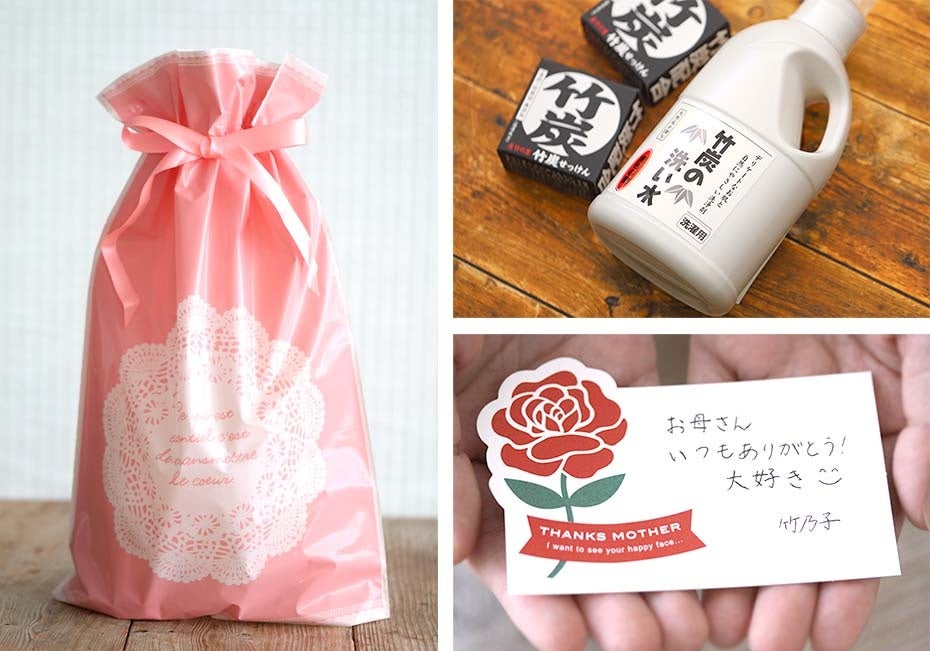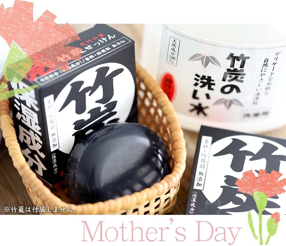 「母の日ギフトセット」は、竹炭を原料としたお肌にも環境にもやさしい自然派洗剤「竹炭の洗い水」と「虎竹の里 竹炭石鹸」2個がセットになっており、さらに竹虎創業130周年記念として「竹酢泡石鹸ハンドソープ」を1本無料でプレゼントしています。