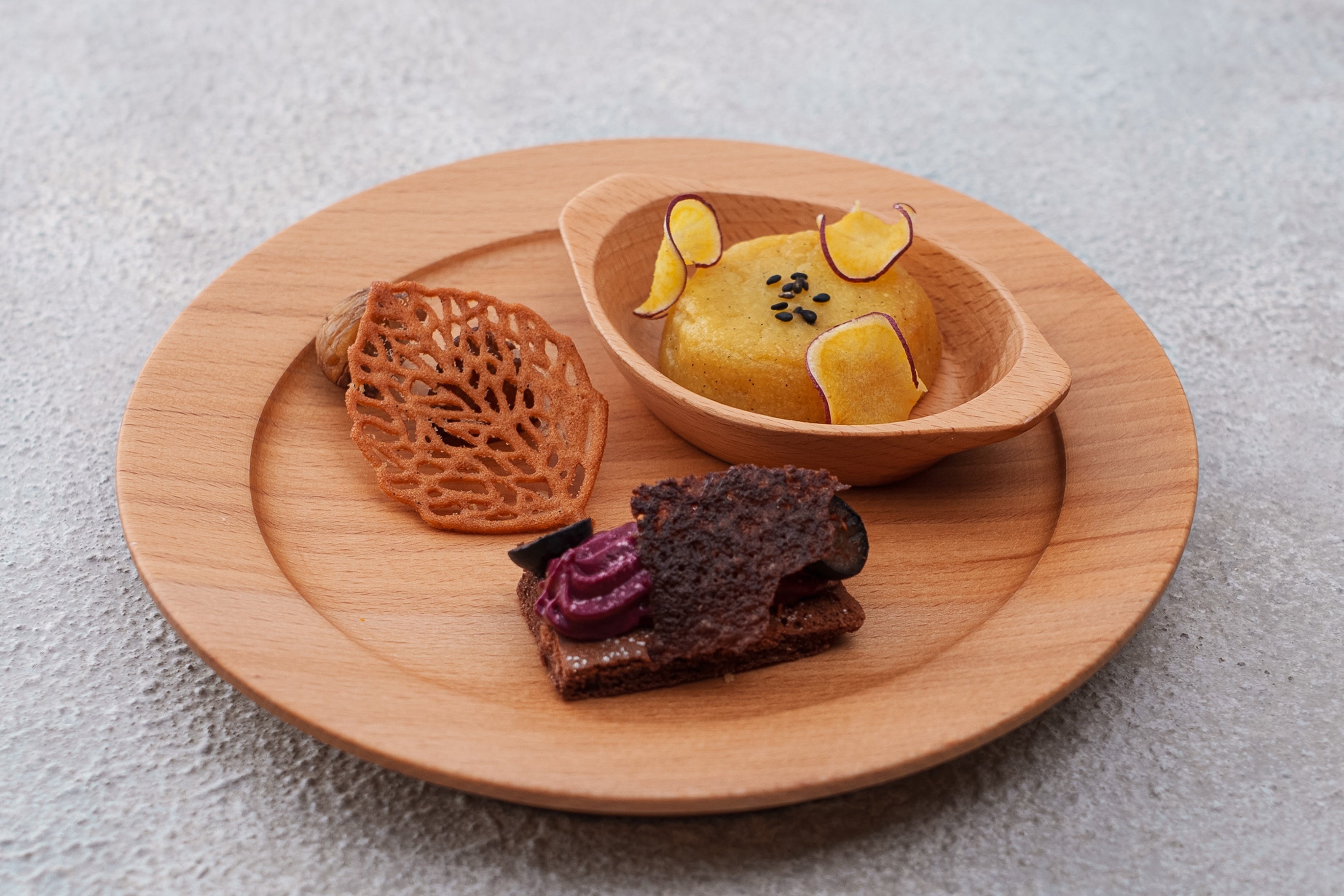 2段⽬には、森の散策中に見つけたかのような秋の風景が広がります。ペースト状にしたお芋に、卵黄やきび砂糖、洋ナシリキュール、生クリームを加え、お芋そのものの形に戻して丁寧に焼き上げた「スイートポテト」、ココア生地の上に色鮮やかなカシスムースをのせ、さらにチョコレートのチュイルとブルーベリーを飾りつけた「カシスのムース」、落ち葉に見立てたチュイルの下に栗を忍ばせた「蜂蜜のチュイル」をご用意しました。