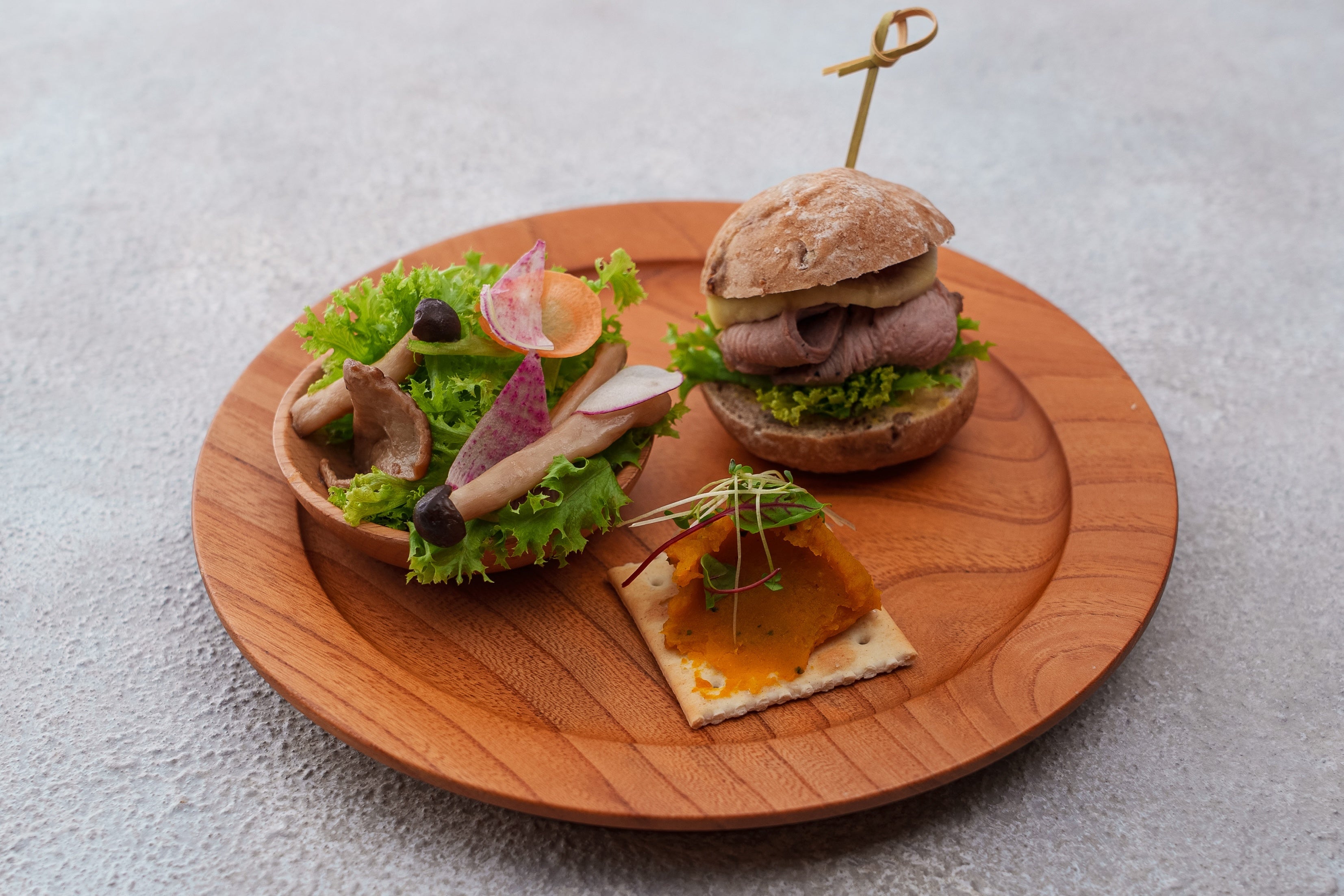 3段目のセイボリーには、くるみとイチジクのパンにやわらかな鴨のローストを挟んだ「鴨ロースとイチジクのバーガー」、カボチャの甘みとスパイスの風味が効いた「カボチャディップ クラッカー」、森の恵キノコとシャキシャキ食感の野菜を清涼感ある梅ドレッシングで召し上がっていただく「キノコのサラダ」をご用意します。