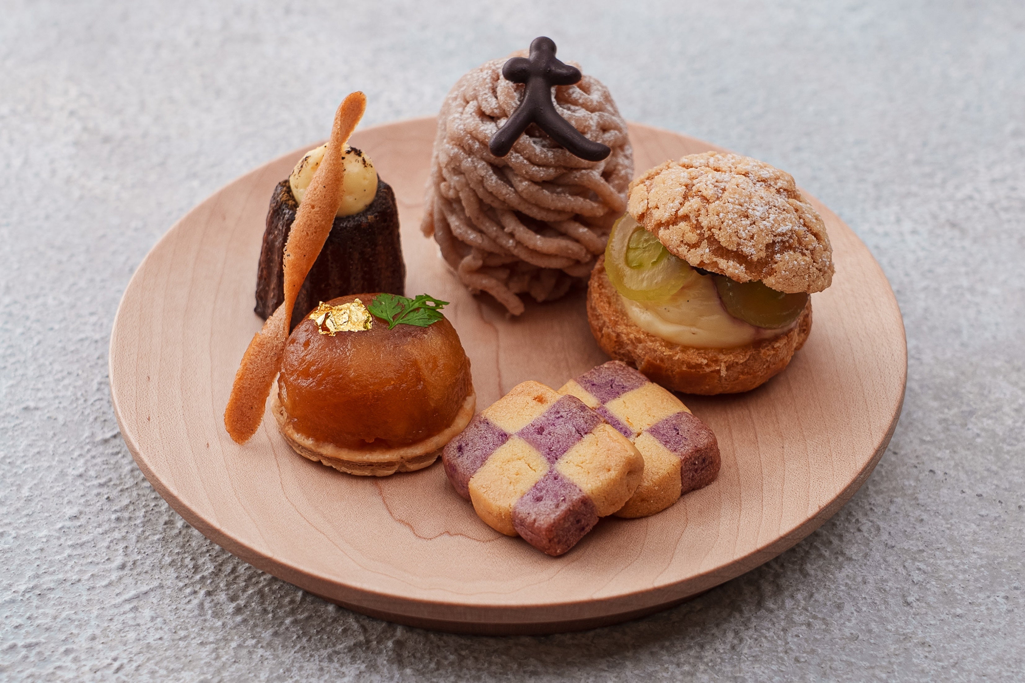 1段⽬には、秋の味覚を集めたバラエティ豊かなスイーツが登場。ホテルからも望むことのできる明星ヶ岳(通称大文字山)からインスピレーションを受けた、「大」の文字をトッピングした遊び心いっぱいの「栗のモンブラン」、秋の果物の代表とも言える葡萄を使ったジャムとカスタードクリームの爽やかな「葡萄のシュークリーム」、自然の木々の色合いが魅力の箱根寄木細工をイメージした「紫芋とオレンジクッキー」、甘みが強く香りの良いリンゴをコンポートに仕上げ、サクッとした食感のパイ生地に乗せた「アップルパイ」、色づきはじめる山々を彷彿とさせる「カヌレ」には、秋の彩りを表現して、カスタードクリームやほうじ茶パウダー、小枝に見立てたチュイルをトッピングしました。