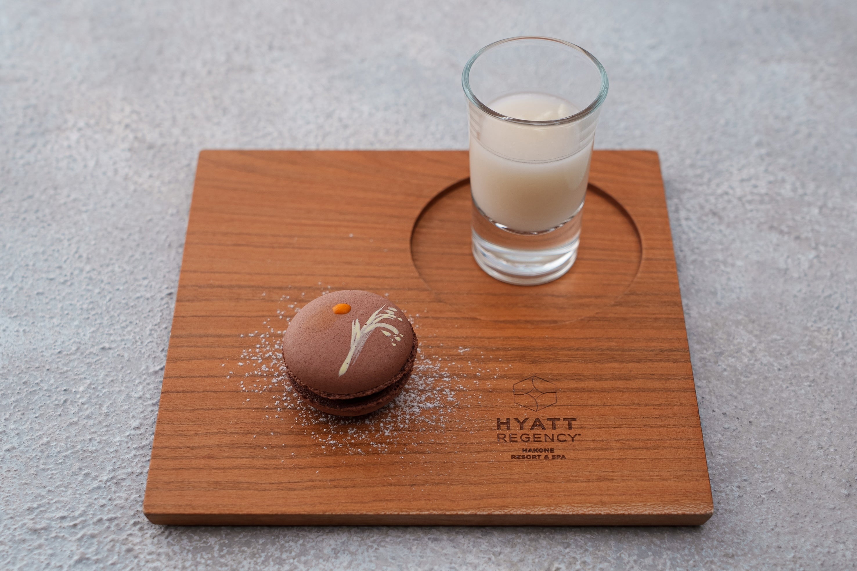 ペストリーシェフ風戸がお届けするアフタヌーンティーは「コース料理がスタートする際のワクワクする気持ちをアフタヌーンティーでも味わって頂きたい」という想いから毎回スターターをご用意しています。今回は、夏の疲れを癒し免疫力アップにも効果的な自家製の「冷やし甘酒」からスタート。さらに、箱根の人気スポット仙石原のススキや秋のお月見を連想させる月とススキを描いた「お月見ラズベリーマカロン」をご用意しました。ラズベリーのバタークリームとジャムを挟んだマカロンはサッパリと甘酸っぱい味わいです。