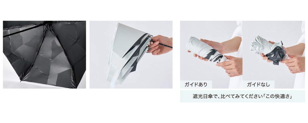 ガイドシート構造の最適化により、遮光コーティングを施していない雨傘(同サイズ)とほぼ同等の軽量化を実現。本体重量約173gの、携帯性に配慮した軽量設計です。